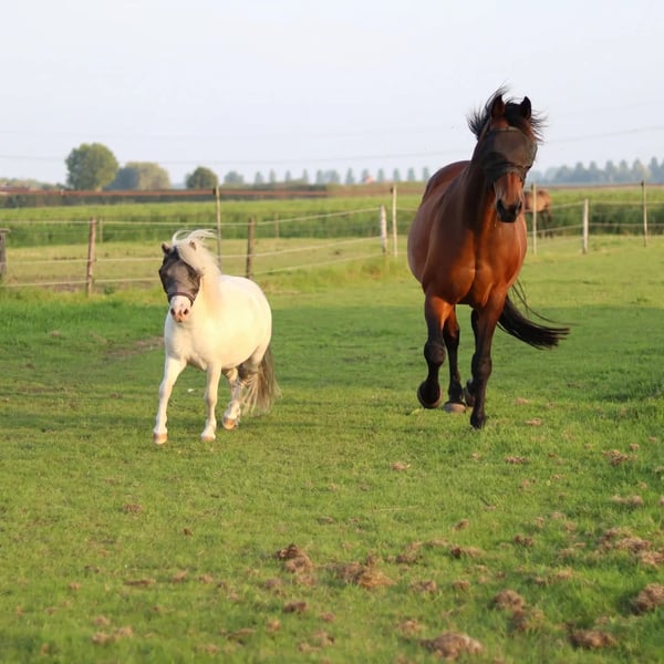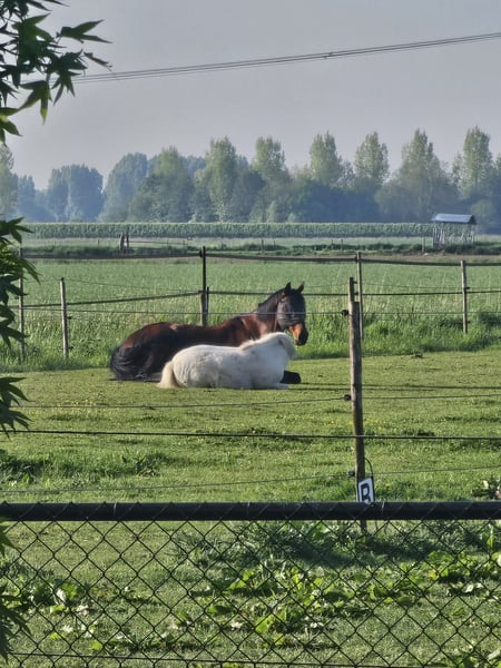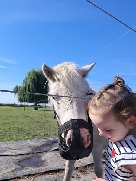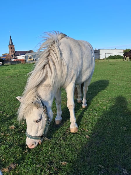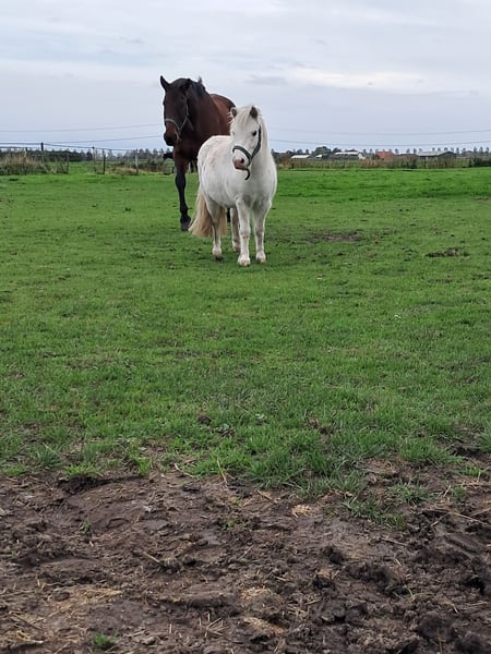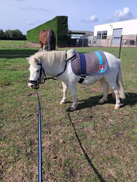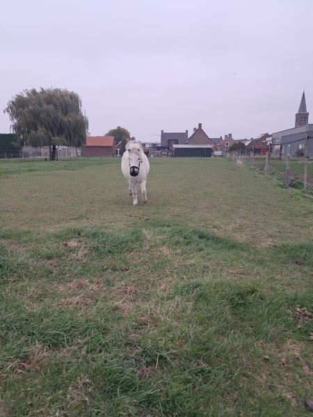 Kruising Fewspot appaloosa X Shetlander Storm is een 4,5 jaar oude ruin van 95-100 cm Geboortedatum 02-02-2021 Hij is helemaal wit, met enkele zwarte stippen Onbeleerd, maar kent het meelopen aan een halster, vaststaan tijdens poetsen, hoofdstelletje. Energiek, nieuwsgierig en heel sociaal! Consequente aanpak nodig, en is gek op aandacht. Braaf bij hoefsmid. Storm heeft aan zijn achterbenen een klein aandachtspuntje. Met de juiste manier van bekappen blijft dit onder controle. Hij heeft er geen last van en hoe meer beweging en spierkracht hij krijgt, hoe minder het zichtbaar is. Zijn hart zit op de juiste plaats, maar door zijn enthousiasme kan hij soms een boefje zijn. Tijdens het poetsen de poetskoffer leeghalen, in de wei komt hij je graag helpen met klusjes (lees: de kruiwagen omver duwen), kortom een echte clown. Het is een echte knuffelkont en zal altijd bij je komen. Hij is gevoelig voor hoefbevangenheid, en moet daarom op het gras een graasmasker aan. Hij is gewend om in de zomer 24/7 buiten te staan, en in de wintermaanden staat hij 's avonds en 's nachts op stal. Ik vind hem door zijn puber-gedrag (nog) geen kinderpony, en daarom is hij ook nog onbeleerd. Storm is nog niet bij een tandarts geweest, die zou eind dit jaar op de planning staan. Entingen en wormtesten op orde. Ik kan Storm helaas niet bieden wat hij nodig heeft, en zoek daarom een liefdevol en passend nieuw thuis, waar hij weer de volle aandacht kan krijgen. Want daar is hij gek op! Goed thuis heel belangrijk, handelaren hoeven niet te reageren! Locatie: Kruisland