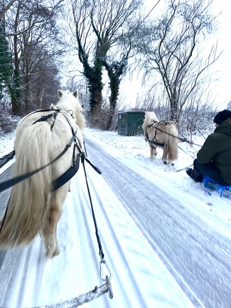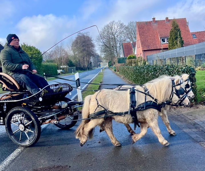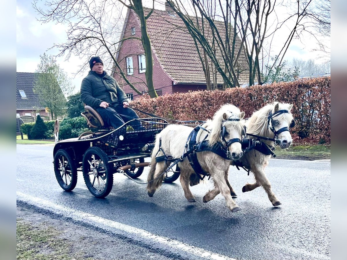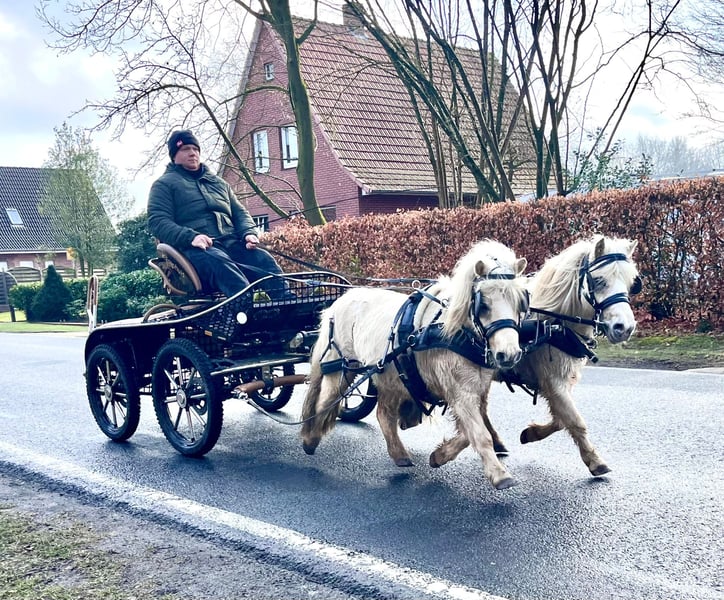 Palomino harness Shetland gelding, 6 years old (born in 2020), approximately 95 cm tall. Broke to drive single (gig and sleigh) and double, well-behaved in traffic and handling. Experienced in led riding and familiar with children. Recently seen by the veterinarian, vaccinated, and dewormed. Sold with a current pre-purchase exam. The listed price is for both ponies together, excluding any accessories. Reservations are only accepted with a deposit. All rights reserved; subject to prior sale and errors. We regularly have other driving and children's ponies available. For inquiries or questions, please contact us by phone at: 0174 8456302 Kamphuis Sporthorses GbR Uelsener Str. 56 49843 Halle