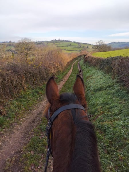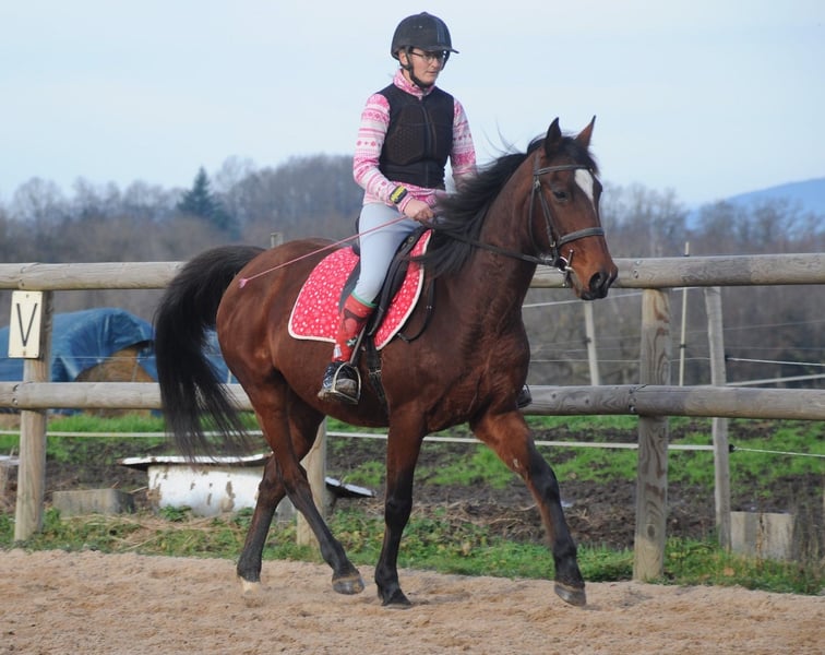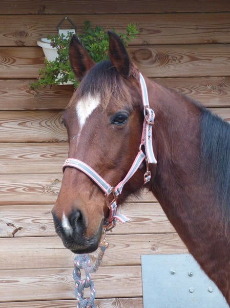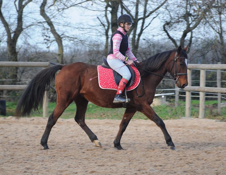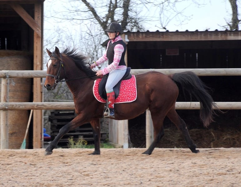 Flashdance Sallaz Trotteur français Jument 11 ans 1m55 Flashdance a un passé un peu flou, elle n'a jamais couru, elle a certainement été essayée à l'entraînement dans ses jeunes années sans résultat, et elle a été utilisée comme mère porteuse ces dernières années, elle aurait eu un poulain. Elle est arrivée craintive de toute manipulation, un très gros travail à pied a été nécessaire et elle a bénéficié d'un partenariat en shiatsu, ce qui l'a également beaucoup aidée. Elle s'est progressivement détendue jusqu'à devenir une adorable jument proche de l'homme, elle a appris à avoir confiance en nous et en elle. Elle a maintenant de bonnes bases en dressage et s'avère plaisante sous la selle. Elle ne bouge pas au montoir et reste calme à l'arrêt, elle a les déplacements latéraux au pas (épaule en dedans et cession à la jambe), les départs au galop sont bien acquis et elle galope en équilibre aux deux mains, avec un très bon galop. Elle ne s'appuie pas, ne chauffe pas, elle est calme tout en ayant l'énergie suffisante pour être agréable. Elle n'est pas travaillée montée à l'obstacle pour l'instant, elle saute facilement 90 cm en longe. Elle sort seule en extérieur, elle y est à l'aise et tout aussi agréable qu'en carrière, elle fera une très bonne jument de balades et même de rando car elle est allante et plutôt porteuse, avec de bons pieds. Elle connaît les voitures et les chiens qui ne lui posent aucun problème. Flashdance est une jument que j'apprécie beaucoup, expressive, intelligente, avec une vraie personnalité. Elle peut correspondre à des cavaliers à partir d'un niveau galop 4. Elle est à jour de parage et vermifuge. Flashdance est visible à Saint-Romain-sous-Gourdon (71230) en Saône et Loire