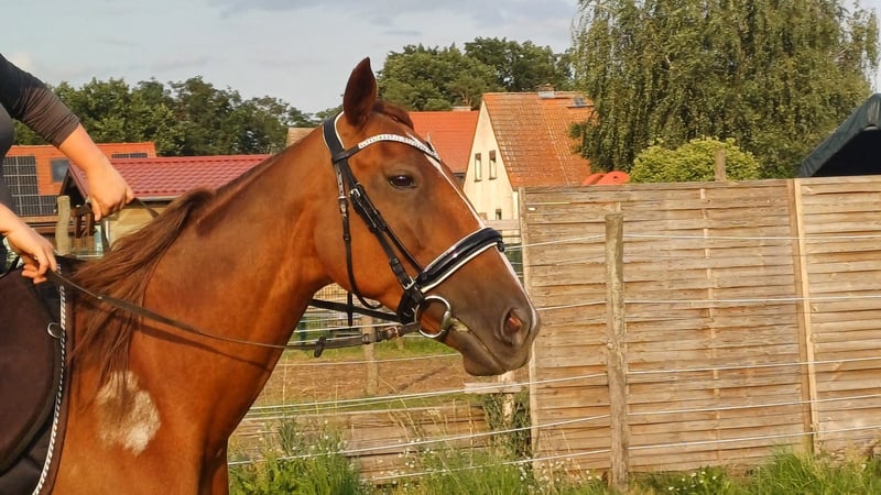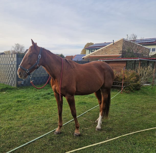 Hallo, suche für meine schöne Traber Stute Hope ein neues Zuhause. Sie ist 8 Jahre alt, 164cm groß und hat einen Charakter aus Gold. Sie ist ranghoch was auch leider der Grund für die Abgabe ist. Da sie mit meiner ersten Stute (halbseitig blind) zu zweit im Paddock steht. Bei der Arbeit braucht sie eine liebevolle, konsequente Hand, zeigt sich aber auch sehr lernbereit, aufgeschlossen und konzentriert. Sie wird aktuell geritten und durch regelmäßige Bodenarbeit und longieren gefördert. Zuletzt hat sie die Freiarbeit kennengelernt (noch nicht so gefestigt). Ich gebe sie als Freizeit- / Familienpferd ab, da sie auch sehr menschenbezogen und verkuschelt ist. Sie ist schmiede-, verladefromm und zeigt sich beim Tierarzt auch brav. Sie ist kerngesund, hat die erste Impfung schon und ist entwurmt. Folgendes Zubehör ist schon im Preis enthalten: - 2x Halfter - 1x Halfter- Kappzaum - 1x Fesselkopfgamaschen - 1x Hufglocken - 1x Regendecke - 1x Outdor-Decke 50g - 1x Outdor-Decke 100g - 1x Fliegendecke - 1x Fliegenmaske - 1x Fliegenhaube Probereiten ist möglich jedoch mit einem Reitpad. Ich bitte nur um ernsthafte Anfragen.