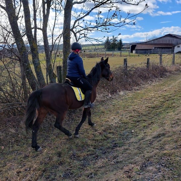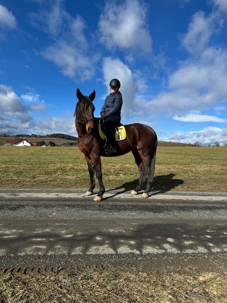 Xaver ist ein ganz lieber, netter und hübscher Traberwallach. Er ist 10 Jahre alt und ca 1,58 m groß. Er ist ganztägigen Koppelgang in einer größeren Herde gewohnt. In der Herde ist er total unkompliziert und sicherlich auch für eine Offenstall-Haltung geeignet. Xaver war ein treues Rennpferd, wurde immer bestens versorgt und geliebt. Deshalb haben wir uns jetzt Zeit gelassen, ihn mit Ruhe zu einem soliden Freizeitpferd auszubilden! Er ist ein fantastischer Ausreitpartner für stundenlange Geländeritte. Er geht immer zügellos im Schritt, brav im Trab, (noch) schnell im Galopp und entspannt sich danach gleich wieder. Ich reite ihn gerne gebisslos, ist aber kein Muss. Im Viereck geht er auch brav, allerdings hat er den Sinn noch nicht verstanden. Longieren und Bodenarbeit machen ihm Spaß. Er ist sehr genügsam und angenehm, er geht gerne jeden Tag, es stört ihn aber auch nicht wenn er nur 2x im Monat bewegt wird. Er ist das ideale Pferd für Wander- und Distanzreiter. Sicherlich ist er auch für Wiedereinsteiger geeignet. Sehr brav beim Hufschmied und Transport.
