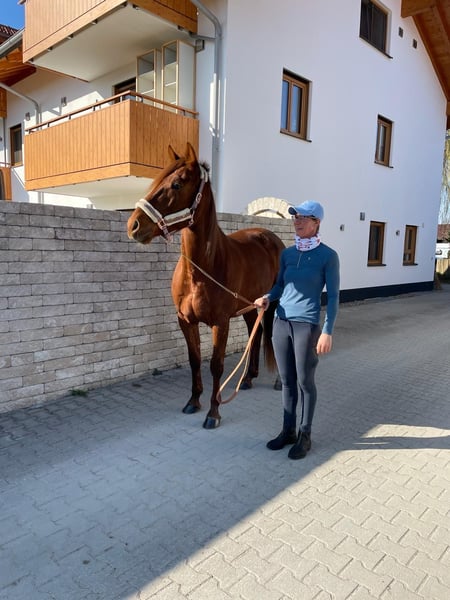 Wunderschöner Traber Fuchs Wallach mit sehr guten liebevollen Charakter sucht seinen Freizeitpartner, der gerne mit ihm fahren und reiten möchte. Lucador ist zurzeit viel im Gelände unterwegs, geht auch schon schön auf dem Viereck, muss aber noch gefördert werden. Kennt alle drei Grundgangarten. Im Gelände geht er alleine und in der Gruppe, er ist im Gelände sehr unerschrocken. Steht derzeit Tags auf der Koppel, nachts in der Box, kennt Offenstall aber auch. Wir suchen einen Partner für Lucador, der ihm weiterhin die Ausbildung bietet, das heißt kein Anfänger. Er ist ein wahrer Schatz, mit dem man durch dick und dünn gehen kann, weil er an allem großes Interesse zeigt. Lucador ist kerngesund. Ist aus dem Sport gegangen, weil er in Deutschland keine Rennen mehr hat. Ist auf allen vieren beschlagen, gechipt, geimpft und entwurmt. Keine Händler und Reitschulen. Fürs Probereiten werden 30€ verlangt.