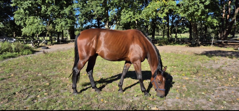 Ich verkaufe meinen 8 jährigen Traberwallach, weil ich ihm zeitlich nicht mehr gerecht werden kann und er es verdient hat weiter gefördert, gefordert und ausgebildet zu werden. Stockmass 165 cm, braun, weißer Fleck auf der Stirn. Er hat ein großes Herz, und hat man dieses ersteinmal erobert, macht er alles für dich. Um seine Qualitäten voll auszuschöpfen, benötigt er einen souveränen Menschen der ihm Ruhe und Sicherheit vermittelt. Dieser Text ist ehrlich formuliert, da ich mir für Ostwind ein für immer zuhause wünsche. Er ist seit 1,5 Jahren Freizeitpferd, gut ausgebildet an der Lounge, Doppellounge, Bodenarbeit, Stangenarbeit. Sowohl Halle und auch draußen. Er liebt Freispringen. Er ist wahnsinnig gelehrig, begreift schnell, setzt dieses sofort um und ruft es dann jederzeit auch wieder ab . Er geht gerne alleine, aber auch in der Gruppe ins Gelände. Nicht Herdengebunden. Auf ungewohnte Geräusche reagiert er manchmal ein bisschen empfindlich. Er lebt in einem Vollpensionsstall, tagsüber draußen, Nachts in der Box. Er steht in einer größeren Wallachgruppe, ist gut sozialisiert, spielt und rangelt auch mal mit seinen Kumpels. Ist aber ehr Rangniedrig. Gesund, gerade geimpft, Zähne gemacht, regelmäßig beim Hufschmied. Artig beim Verladen. Er sollte nur an einen erfahrenen Reiter gehen. Probereiten natürlich möglich.