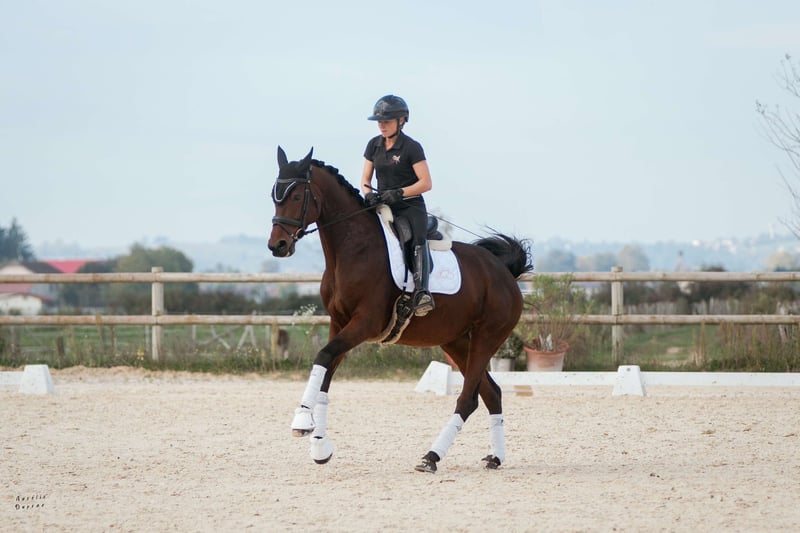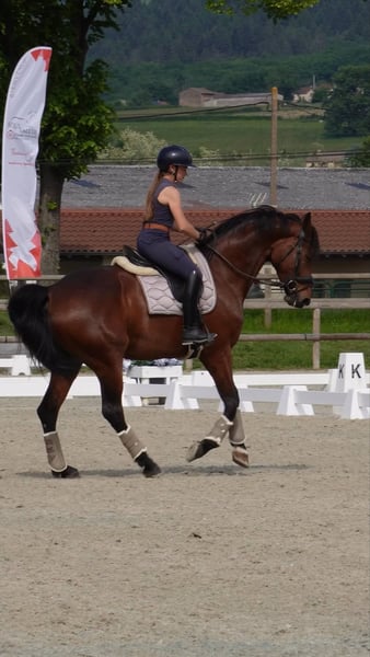 Jument KWPN baie, de 10 ans (2016) et toisant environ 1,72 m, est une jument de dressage à vendre ou à louer, destinée à un cavalier souhaitant évoluer avec un cheval de qualité, déjà bien engagé dans le travail, expressif et avec d’un réel potentiel sportif. Dotée d’un modèle harmonieux et moderne, cette jument présente une orientation sport affirmée, avec du cadre, de l’équilibre et une belle locomotion . Bien construite, elle se distingue par son expression naturelle et son engagement, tout en conservant un fonctionnement juste et fonctionnel. Jument sensible et volontaire, elle possède de la qualité et de l’énergie, ce qui en fait une partenaire intéressante pour un cavalier fin, calme et cohérent, capable de l’accompagner avec tact dans son fonctionnement. Elle se montre attentive et disponible mentalement dans le travail, mais nécessite une équitation précise et respectueuse. Sous la selle, elle offre de belles allures, avec un pas ample et régulier, un trot expressif et actif, et un galop équilibré, laissant entrevoir une marge de progression intéressante vers le rassembler. Elle maîtrise actuellement les appuyers, les changements de pied rapprochés, et commence le travail des demi-pirouettes, montrant une bonne compréhension des exercices et une réelle capacité à évoluer vers un travail plus technique. Présentée en compétition, elle possède une expérience en épreuves Avenir 2, confirmant sa capacité à sortir en concours et à s’exprimer dans un cadre compétitif. Cette jument bénéficie d’une génétique KWPN orientée dressage. Père : Dream Boy (KWPN – NLD) Dream Boy est un étalon reconnu du dressage moderne, apprécié pour transmettre expression, élasticité, énergie et qualité de locomotion, ainsi qu’une vraie aptitude au sport de haut niveau. Père de mère : White Star (Hanovrien) La lignée maternelle apporte cadre, équilibre et fonctionnalité, contribuant à produire des chevaux avec de la force, de la qualité de galop et une bonne capacité à évoluer dans le travail du rassembler. Une combinaison de sangs orientée sport, donnant des chevaux expressifs, techniques et dotés de réelles aptitudes pour le dressage. Mental et profil cavalier Jument expressive, sensible et volontaire, elle présente une vraie qualité de fonctionnement et une bonne disponibilité dans le travail. Dotée d’énergie et de réactivité, elle nécessite une équitation fine, calme et structurée. Bien montée, elle se montre appliquée, à l’écoute et investie, avec une vraie qualité de réponse aux aides. Elle conviendra idéalement à un cavalier technique, encadré et déjà expérimenté, capable d’accompagner une jument sensible dans son évolution. Pour quel projet ? Cette jument conviendra particulièrement : • à un amateur confirmé / amateur + encadré • à un cavalier souhaitant évoluer vers des reprises plus techniques • à un projet orienté dressage sportif, avec une progression vers le rassembler • éventuellement à un professionnel pour poursuite de valorisation Jument déjà bien avancée dans le travail, avec des bases solides et une marge de progression, mais nécessitant un pilotage précis pour exprimer pleinement son potentiel. Pourquoi cette jument ? - Jument KWPN bien née, - orientée dressage Toise environ 1,72 m Expérience en compétition Avenir 2 Appuyers acquis, changements de pied rapprochés Débute le travail des demi-pirouettes Jument expressive, avec de la qualité Demande du tact et une équitation fine Idéale pour un cavalier amateur confirmé ou un projet amateur + / professionnel