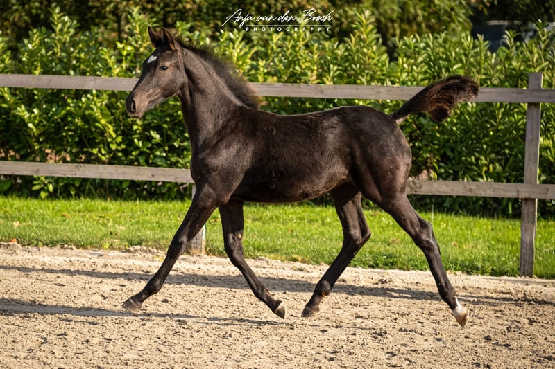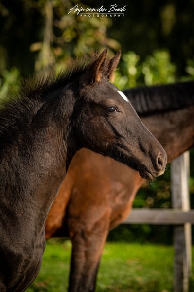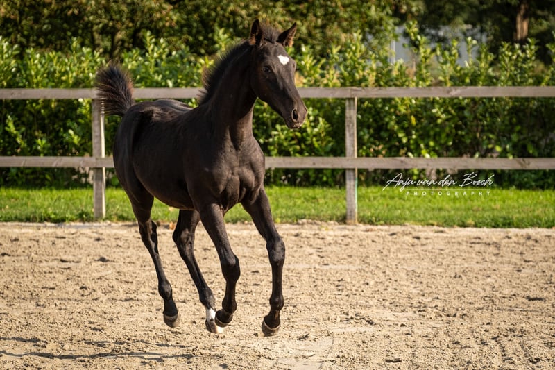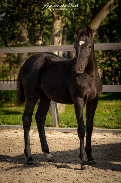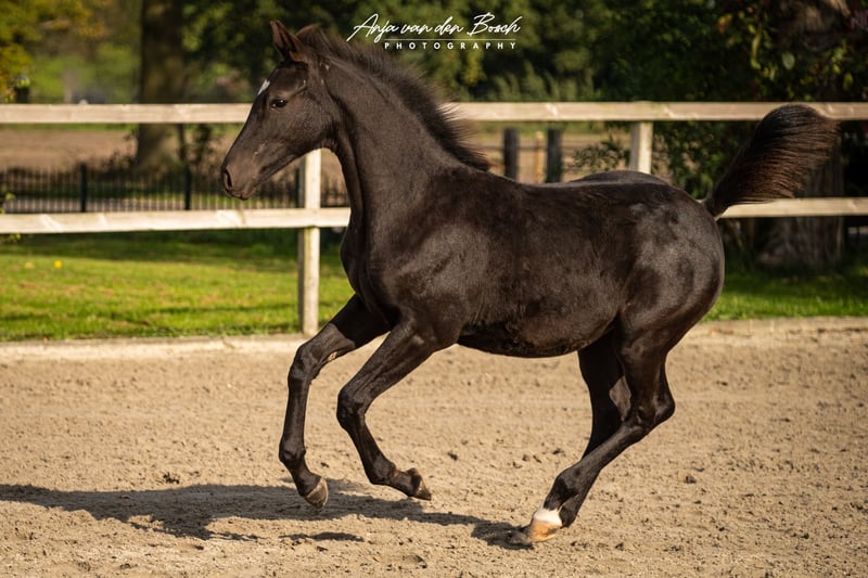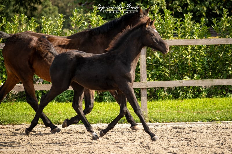 Beautiful black filly foal born on 23-05-2025 Voyage d’Or is a very human-oriented foal. From the beginning, she has been very easy to handle as a foal. She is a very correct foal with strong leg conformation. Voyage's sire is the Olympic stallion Glasgow van het Merelsnest. Voyage's dam, Ulette, is 1.35 m STB STER, PREST-(SPR), PROK. Ulette already has a progeny competing at the 1.35 m level by Berlin. Voyage has everything it takes to grow into a stunning sport horse! There is an option to keep her in our foal nursery.