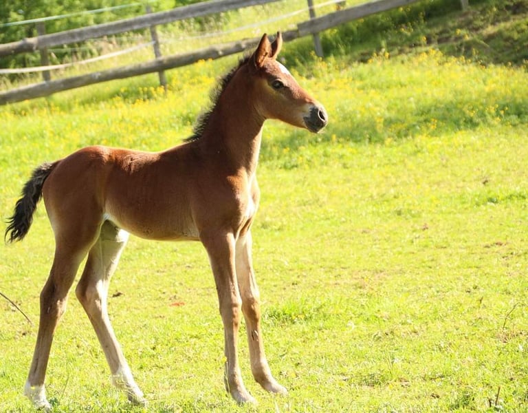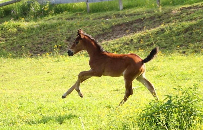 A filly with an absolute top sport line that leaves nothing to be desired! Her sire is the famous IRON MAN VAN DE PADENBORRE He has already been placed in several competitions around the globe, e.g. at the GCT in Paris, Valkenswaard, Prague and many more and has also represented the Belgian colors in several Nations Cup competitions. Some of his offspring are already very successful in the high sport! The little Everybody grows up in a herd on large hilly pastures, which also trains her sure-footedness and nimble feet until she is weaned!