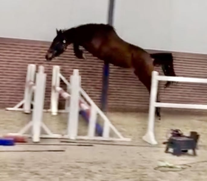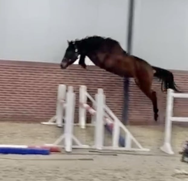 Rising 3 year old bay mare with very special breeding and top showjumping front knee technique The Cassini motherline is very rare and special just in itself .This mare has brothers and sisters jumping the 1.40-1.50cm classes. That’s before she has the father Chacco blue . No time wasters or tyre kickers . This is a serious investment opportunity to purchase a very sweet , well bred and easy to handle mare for the future. Message me on WhatsApp for videos of her first loose jumps . Only serious buyers need message . I can assist with arranging shipping of her.