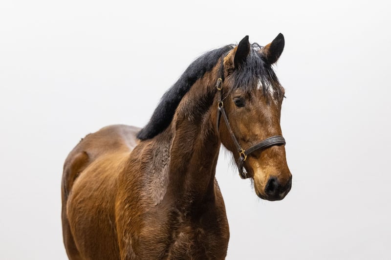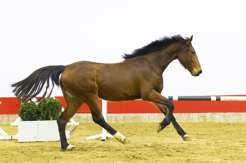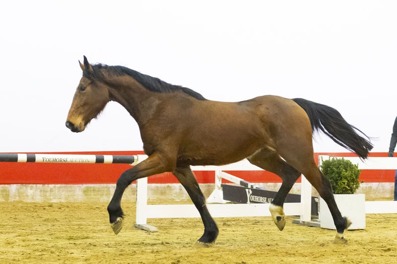 Careful over the jump with good hind leg technique. He jumps very easily and shows great suppleness in his body. He is light-footed in movement, with plenty of scope in his gaits and a big canter. An interesting horse with quality, balance, and a pleasant disposition. Sire Denzel v’t Meulenhof (1.40m) is approved by the KWPN, Zangersheide, and AES and is a son of Marius Claudius (1.60m) out of Narcotique de Muze IV (1.50m). Denzel sired Ipsthar (1.60m), Nixon van ’t Meulenhof (1.60m), and I. Denzel v.h. Meulenhof (1.60m). Dam Oililly is a daughter of Eldorado van de Zeshoek TN (1.60m Grand Prix, approved by the KWPN, BWP, AES, SF, Hannover, and others). Second dam, Funnalve (Indoctro), comes from a strong sport line. In the third generation, we see several 1.30m–1.40m horses, such as Bellealve (1.30m), Harvey-Walve (1.35m), and Camparo (1.40m). Further down the line, we find Nena-Alve DV (1.45m), Glasic Bruers Z (1.45m), Dirocco B (1.50m), and several 1.40m horses. Several approved stallions, such as Olargo-B (1.40m, approved Westf/SF/CDE), Kansas (approved SHBGB/FWB/NRPS), and Irocco (approved AES), also come from this line. This dam line consistently produces 1.40m–1.50m sport horses.