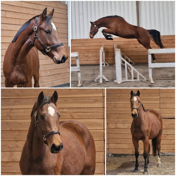Jumente de saut d'obstacles de 2,5 ans, issue d'une lignée de saut d'obstacles. Origine : Comthago x Grand Slam x Verdi. Née le 6 juin 2023, avec une taille d'environ 1,66 m. Elle vient tout juste de sortir de l’élevage, connaît la marche en licol/corde. Pour le reste, elle n’a pas encore été formée. Elle a sauté pour la première fois en liberté, et elle s’en sort très bien ! À l’écurie, elle prend parfois la direction du manège, c’est pourquoi son prix reste dans la gamme standard. Pour plus d’informations, n’hésitez pas à appeler ou à envoyer un message via WhatsApp au 0613704472.