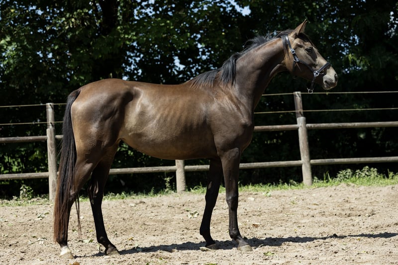 Zeer aansprekende valk merrie. Ze is zadelmak en wordt verder aangereden op het moment. Mens gericht en braaf in de omgang. Staat met andere paarden op de paddock. Is bij ons gefokt, moeder ook aanwezig. Merrie kan fijn bewegen en zou zeer geschikt zijn voor de dressuur. Opvallende verschijning. X-ray gekeurd.
