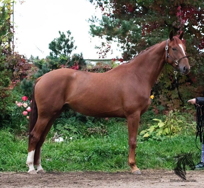 Year of Birth: 2021 · Height: 173 cm (17 hh, still growing) · Color: Chestnut · Breed: KWPN (Dutch Warmblood), full import pedigree. · Sire's Line: Edelson (KWPN) - lines of Zhivago, Krack C, Gribaldi. · Dam's Line: White Rose (Hannover) - lines of World Diamond, Rotspon. · Temperament: Exceptionally kind, people-oriented, and calm.