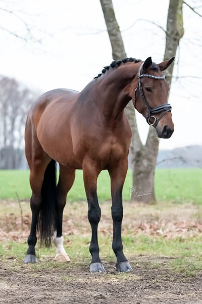 Stute Despacito x Benneton Dream ca. 173 cm Diese äußerst talentierte Stute verfügt über eine elegante Gangart und ein sehr gutes Hinterbein. Ein Pferd mit überdurchschnittlicher Qualität, sehr brav im Umgang und unter dem Sattel. Das Pferd ist gelassen und zeigt sich unter dem Sattel absolut unerschrocken. Keine Marotten einer Stute, lieb und freundlich auf der Stallgasse. Sie ist circa 174 cm groß und steht gerade auf den Hufen. Bereits war sie auf fremdem Gelände unterwegs, was sie sehr brav meistert. Auch im Wald zeigt sie sich brav. Ein sehr feines Pferd für jemanden, der in der Turnierpferdeklasse glänzen möchte! Das Pferd ist vollständig sporttauglich geprüft, inklusive Beinen, Rücken und Hals.