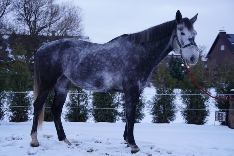 Schweren Herzens trennen wir uns aus zeitlichen und persönlichen Gründen von unserer 6 jährigen spring gezogenen Schimmel Stute. Hope (Duel‘s Girl) ist eine 6 jährige Schimmel Stute. Sie misst ein Stockmass von ca 1,75 m. Sie ist sehr verschmust, menschenbezogen und kopfklar. Hope ist solide angeritten auf A Niveau und springt auch mit dem passenden Reiter einen kleinen Parcours. Aufgrund eines Befundes, welcher gerne auf Wunsch geteilt werden kann, Röntgenbilder liegen vor, wird sie weit unter Wert und nur an den passenden Menschen ohne Turnierambitionen verkauft. Sie kann weiterhin geritten werden. Wir könnten sie uns auch als Beisteller für andere Pferde vorstellen, für jemanden der sich trotzdem noch mit dem Pferd beschäftigen möchte und auf Freizeit Basis arbeiten möchte. Anfragen bitte nur per Telefon oder WhatsApp unter 01796024094.