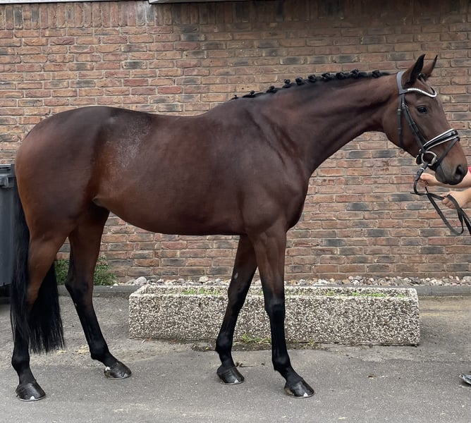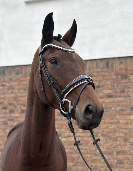 Genius and madness at the same time… Very elastic mare with 3 great basic gaits and a lot of expression! The art with this horse lies in keeping her supple. She is pleasant to the leg and also in the hand, but is environmentally oriented. One can quickly find oneself in a situation where she lifts herself and then freezes. In the walk, one can always let go, and she strides with a long neck, even at competitions. Lateral movements come easily to her. She is M level safe and has been placed multiple times. S-level exercises as well as talent for piaffe and passage are present, but not yet firmly established. She is familiar with pole work and can be ridden both alone and in a group in the field. She is very well-behaved in handling. Current X-rays are available!