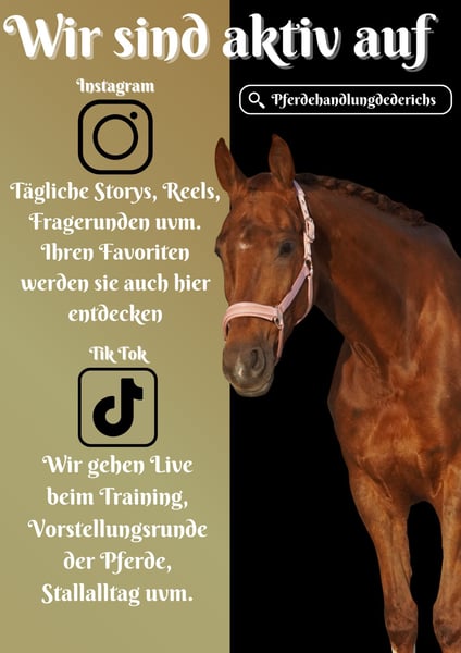 Orange Queen ist eine 7 Jährige KWPN Stute ca. 1,67 cm v. All at once, Ampere, Gribaldi x Stedinger, Sandro Hit, Cavalier *Orange Queen* ist eine bildschöne ganz rittige und coole Stute. Sie eignet sich super als Schulpferd. Turnierplatziert und erfahren. Sie geht ganz leicht in der Anlehnung ist nicht empfindlich oder hitzig an den Hilfen. Orange ist bequem zu sitzen und gibt einem ein super sicheres Gefühl. Sie geht brav im Gelände und auch im Straßenverkehr. Sie macht einen netten Sprung und auch die Stangenarbeit bereitet ihr Freude. !!! SCHAUEN SIE SICH UNBEDINGT IHR VIDEO AN !!! Im Umgang auch ein Schatz. Verschmust und gut erzogen, nicht stutig. Eine aktuelle AKU bringt sie bereits mit. Ein aktuelles Video finden Sie hier in der Anzeige oder unter folgendem Link: https://www.youtube.com/watch?v=SdnWTBh-gzM Pferdehandlung Dederichs – Ihr Partner für den Pferdekauf Kontakt & Erreichbarkeit: Anfragen bitte ausschließlich telefonisch unter 0173/9792139 Montag – Freitag: 09:00 – 18:00 Uhr Samstag: 09:00 – 15:00 Uhr Sonntag: Ruhetag Folgen Sie uns auf Social Media! Erleben Sie unseren Alltag mit den Verkaufspferden auf Instagram, TikTok & Facebook unter Pferdehandlung Dederichs Rabatt: Bei sofortiger Mitnahme Ihres neuen Traumpferdes erhalten Sie zwischen 5 %– 10 % Rabatt Probereiten & Vorführen: • Probereiten: 40 € pro Pferd (max. 2 Reiter), Betrag wird beim Kauf angerechnet • Feiertage: Proberitt 50 € • Vorführung durch unsere Bereiter: 30 € pro Pferd (Vorreiten, Bodenarbeit etc.) Ankaufsuntersuchung & Transport: • Viele unserer Pferde besitzen bereits eine AKU • Sie können selbstverständlich Ihren eigenen Tierarzt mitbringen • Gerne organisieren wir eine Untersuchung • Wir unterstützen Sie auch gerne beim Transport ins neue Zuhause Weitere Verkaufspferde: In unserem Stall stehen weitere Verkaufspferde, die noch nicht online sind. Falls Ihr Traumpferd noch nicht dabei ist, zögern Sie nicht, uns zu kontaktieren. Wichtige Hinweise: • Stockmaß-Angaben sind geschätzt und nicht exakt nachgemessen • Alle Beschreibungen sind subjektive Einschätzungen des Verkäufers und keine zugesicherten Eigenschaften