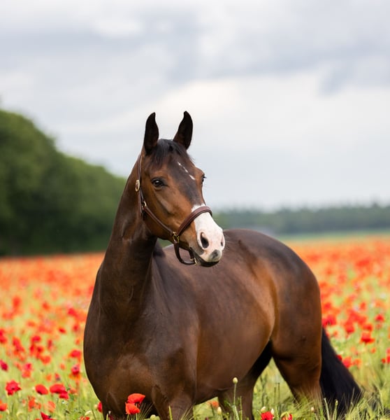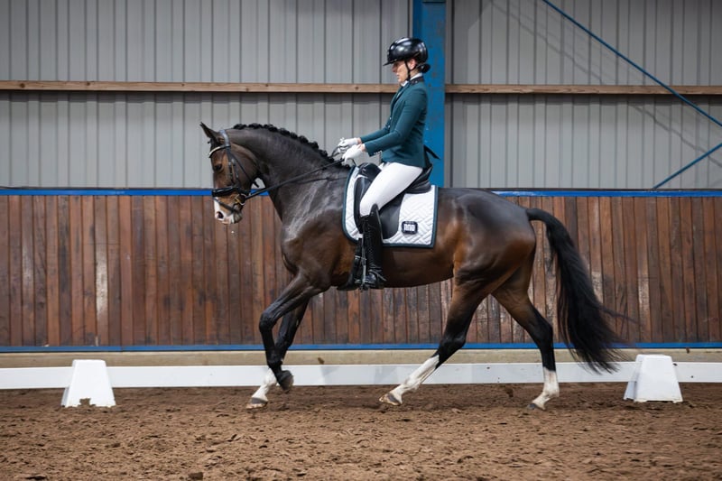 Stunning dark bay elite IBOP-prok D-OC mare Height: 1.70 m Sired by James Bond x G Ramiro Z KWPN registered Very strong sport-oriented dam line Specializes in dressage This sweet mare is more phlegmatic than excitable or sensitive. She is easy to load onto the trailer and enjoys competing. Whether in the arena or along the road, she is well-behaved and completely traffic-safe, happily joining rides in the forest alone or in a group. She has competed successfully in M-level dressage, performing with ease. She possesses three lovely gaits and offers exceptional ease in lateral movements, currently being trained towards Z-level. She takes simple flying changes very easily. She is also well-behaved with a rider who is still gaining experience and has not put a foot wrong. She jumps confidently up to 1 meter and seems to enjoy it greatly, whether over standard or natural obstacles. She clearly thrives on variety in training and would also make a versatile all-rounder. Multiple videos and additional information available via WhatsApp. +31 652 539 025 (speaking Dutch, German, and English)