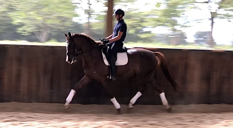 Ta 6-letnia klacz ma dobry chód i bardzo dobry galop. Zachowuje się grzecznie w codziennym kontakcie, podczas załadunku i u kowala. Przechodzi trening zmian.