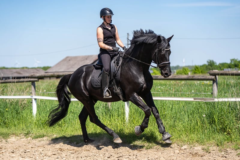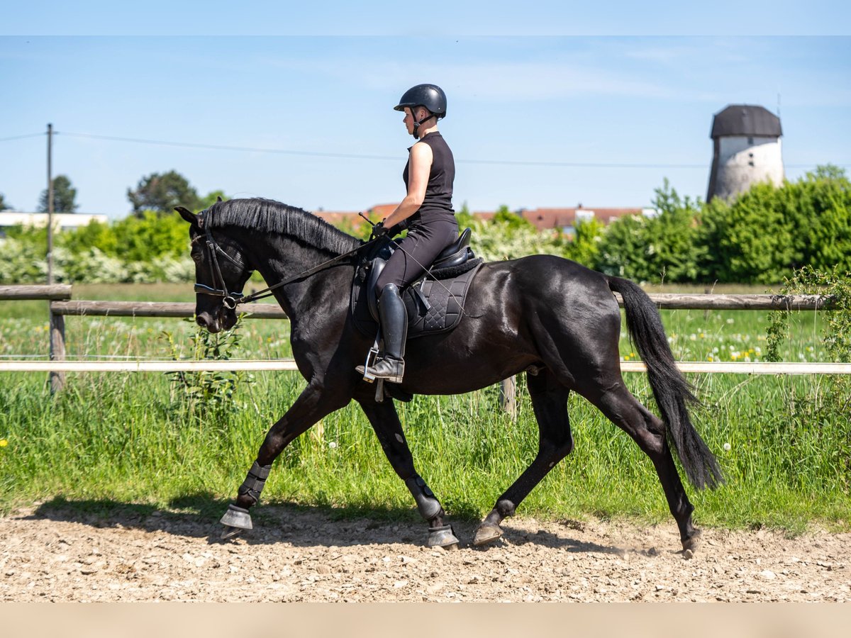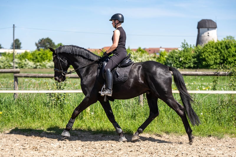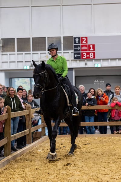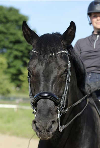 Due to my retirement from riding, I am selling my 2012-born black stallion by Johnson (KWPN), out of a Trakehner mare by Kostolany. He has a spacious, expressive walk, as well as a lively, comfortable trot and canter. He is experienced in L-level dressage, free jumping, cross-country (alone and in groups), water crossings, fair appearances, working equitation, trail obstacles, and cattle work. He is consistently calm, trusting, and demonstrates a positive work attitude. Even in stable tents, unfamiliar situations, and in the presence of mares, he remains easy to handle. He currently shares pasture with mares and foals and gets along well with geldings. I see him excelling in dressage, eventing, or working equitation. He has not been jumped under saddle but shows talent in free jumping and over cross-country fences. Due to time constraints, he is currently not in regular training. A trial ride costs €50.