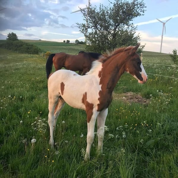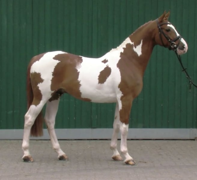 Bonanza, alias Fullcolour van Nethe, Una colorazione molto di tendenza!!!! Bonny è l’unico stallone pintato del secolo, discendente dal famoso riproduttore Baloubet du Rouet, da una madre Samico. Trasmette il gene del mantello a circa il 50%, ma ha già prodotto molti soggetti con il caratteristico manto pintato. Possiede un carattere eccezionale, che trasmette anche ai suoi discendenti. In maneggio si comporta più come un gelding. Ha trascorso diversi anni in Ungheria, dove era molto apprezzato e richiesto. Anche qui è difficile trovare suoi discendenti in vendita, poiché sono molto bravi, desiderosi di lavorare e facili da montare. La nostra prima cucciolata è stata molto promettente, e lo scorso anno ha coperto circa 20 fattrici presso di noi, con successo naturale. Non è molto grande di statura, ma trasmette generalmente un’altezza normale o leggermente superiore alla media. Bonanza ha superato la sua HLP nel 2014 a Neustadt/Dosse, ottenendo un punteggio finale di 8,03, con focus sulle capacità di salto. Da lui si sono ottenuti soggetti fino a livello S, ed è rimasto in ottima forma e molto mansueto fino alla fine. Negli ultimi 1,5 anni lo abbiamo utilizzato esclusivamente come stallone da monte. Potrei immaginarlo anche come cavallo da scuola in un centro di allevamento. L’ultima volta ha coperto presso di noi in natura, ma conosce anche il metodo con il fantino. Si comporta molto bene alla catena di monta ed è piuttosto timido. Contattatemi tramite WhatsApp o telefonicamente. Numerosi video sono disponibili online sotto il suo nome. Lo vendiamo solo se si presenta la giusta opportunità e se viene pagato il prezzo richiesto!!!