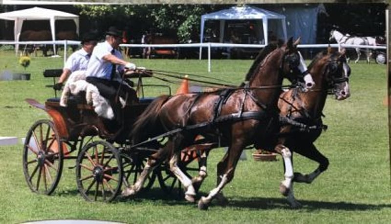 Two outstandingly bred 16-year-old Dutch sport horses seen in the pictures are looking for a new home. Both are healthy, trained to drive, and possess expressive, dynamic movements as well as a striking, elegant appearance. They have a stable nervous system, are intelligent, and well-balanced. All papers, vaccinations, and blood tests are complete and in order. They make a perfect pair and are both safe in traffic and on trails. Both participate successfully in driving competitions (Category C, Szlv). They have had the same owner for 14 years. I would be happy to send videos of the horses via private message if interested.
