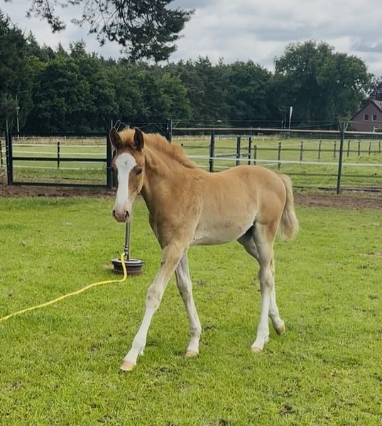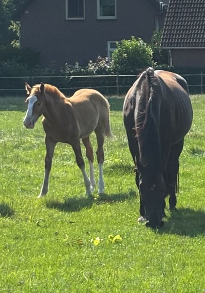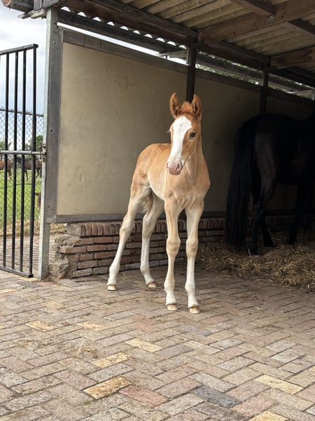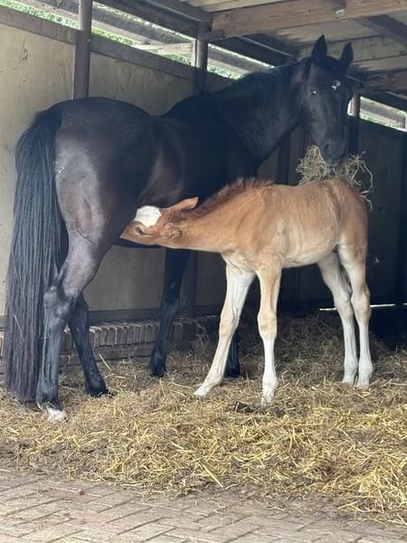 Bent u op zoek naar een veulen met uitstraling, kwaliteit en karakter? ⚜️ Viper de Elegante CH ⚜️ Buitengewoon mooie en veelbelovend hengstveulen, voortgekomen uit een unieke kruising tussen het temperamentvolle Spaanse bloed van de PRE en de moderne elegantie van het KWPN. Hij is niet alleen een echte blikvanger o.a. met zijn ogen, maar beschikt ook over alles wat men zich wenst voor een succesvolle toekomst in de sport én als betrouwbare partner. KWPN-hengstveulen, geboren op 05-05-2025 uit Elegante de Millan III x Obelisk x Jeraldo x Burggraf Verwachte eindmaat: + 1,70 m Onze veulens staan – wanneer het weer het toelaat – vanaf de geboorte 24/7 buiten. Talrijke studies tonen aan dat dit de basis vormt voor een bijzonder sterk paard. Daardoor zijn ze later minder blessuregevoelig en ontwikkelen pezen en botten een extra sterke weerstand. Ze groeien op als familie – merries, hengstveulens en merrieveulens samen – wat hun sociale ontwikkeling enorm bevordert. Iets wat veel veulens in hun eerste levensmaanden missen. Ook later in de opfok leven ze in een gemengde kudde met paarden van alle leeftijden. Dit zorgt voor een goede opvoeding binnen een duidelijke hiërarchie. Zo krijgen onze veulens een sterke basis en de best mogelijke start in het leven. Daar profiteren ze hun hele leven van – en ook voor de toekomstige eigenaar is het een groot pluspunt om een paard te hebben met zo’n gezonde en stabiele basis. Onze veulens worden al kort na de geboorte gewend aan alles: tractor, bladblazer, paraplu, bosmaaier – alles wat in het dagelijks leven lawaai maakt. Met een ontspannen moeder aan hun zijde beschouwen ze dit als volkomen normaal. Voetjes geven, vaststaan, geborsteld worden en overal aangeraakt worden – dat hoort er vanaf het begin bij. Ook hoefsmid, chippen en ontwormen verlopen volledig probleemloos.
