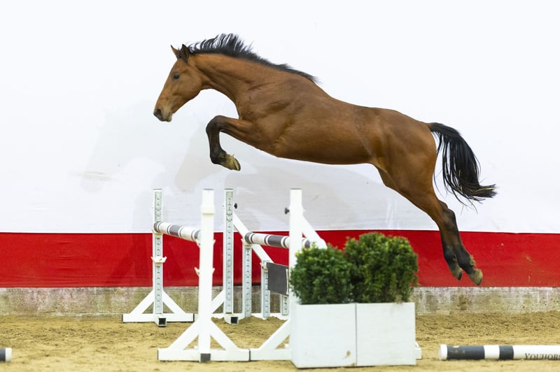 Mooi, al groot ontwikkeld paard met een fijn karakter. Hij heeft een makkelijke galop met veel balans en draaft met kwaliteit. Naast zijn goede gangen oogt hij comfortabel om later op te rijden. Op de sprong toont hij vermogen en een correcte manier, met overzicht en techniek. Een compleet sportpaard in de dop met kwaliteit én rijdbaarheid. Vader Grandorado TN N.O.P. (1.60m Grand Prix) won onder andere de Nations Cup in Rotterdam en Dublin op 1.60m niveau. Hij is keur verklaard en goedgekeurd bij KWPN, Holstein, Zangersheide, AES, SF en Hannover. Grandorado bracht reeds meerdere internationale 1.55m–1.60m paarden zoals Le Macho BH (1.60m), Max (1.60m) en Lafayette (1.55m). Via Eldorado van de Zeshoek TN (1.60m) en Clinton (1.60m) is vermogen stevig verankerd in deze vaderlijn. Moeder Hella (v. Quasimodo van de Molendreef 1.60m) komt uit een sterke prestatielijn. Zij is pref en D-OC en gaf onder meer Onassis TN (v. Grandorado), goedgekeurd bij KWPN en Hannover, actief op 1.35m niveau. Tweede moeder Vichella (v. Voltaire 1.60m) bracht meerdere 1.30m–1.40m paarden zoals Chanella (1.40m), Donatello (1.35m), Eros (1.35m) en Fabella (1.30m). Derde moeder Richella (v. Burggraaf) gaf Brandenburg (1.40m). In de vierde generatie zien we een uitzonderlijke sportstam: Bollvorm’s Burggravin (1.60m), Zenzero (1.60m CSI4*), Venus (1.45m CSI2*), Volumia (1.40m), Criss-Cross (1.40m winnaar in Wellington) en meerdere 1.30m–1.40m paarden. Ook goedgekeurde hengsten zoals Ultimo (AES) komen uit deze lijn. Een moederlijn die structureel presteert op 1.40m tot en met 1.60m niveau.
