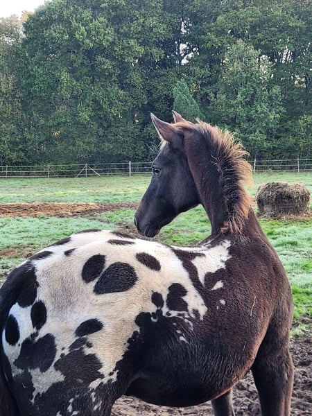 Zum Verkauf steht ein vollständig entwickeltes Pferd, das im Jahr 2026 zwei Jahre alt wird. Es ist schwarz gefleckt, homozygot für das Schwarzgen (getestet a/a, E/E, nd2/nd2, W20/n, LP/n), negativ auf PSSM1 und WFFS. Es wird groß werden (ca. 1,70 bis 1,75 m), hat eine gute Haltung, ein sehr freundliches und menschenbezogenes Temperament, ist gut manipuliert und alle Impfungen sowie Hufschmiedtermine sind aktuell. Herkunft aus dem KWPN-Sportprogramm. Primär für Zucht- oder Turnierprojekte geeignet, aber offen für Gespräche. Ab sofort verfügbar, kann in der Dordogne in der Nähe von Bergerac besichtigt werden. Bei Interesse bitte per Privatnachricht Kontakt aufnehmen für weitere Informationen.