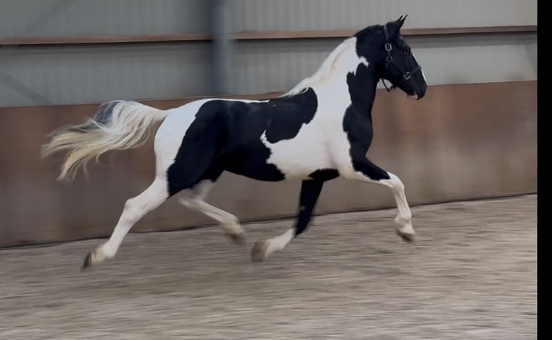 Strikingly beautiful 3.5-year-old black and white stallion. He is super beautiful in his piebald coloring. He is a true showstopper. With a lot of presence and a fantastic leg technique, he moves through the arena. He has full KWPN papers. If interested, please call or message: +31643197337