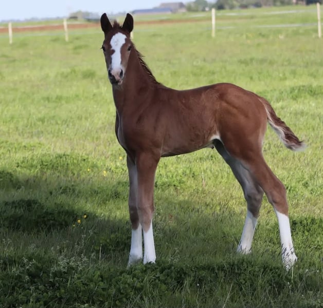 Born in 2023 A true eye-catcher with a beautiful color and four tall white legs. Recently weaned from the mare. Displays three good, correct gaits. Stands correctly on all four legs. No stable or other faults. Expected to reach around 168/170 cm at maturity, currently 164 cm and still overgrown. Sire: Nick Wimphof. Good X-ray results ✔️ Born and raised at home, with all details known. A suitable, caring home is the top priority. Offers are welcome but please keep them realistic. For more information, feel free to send a message or WhatsApp to 0611992494.