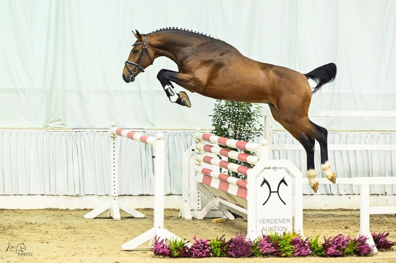 Mit seinem maskulinen Erscheinungsbild und einer beeindruckenden Sprunggewalt setzt Pegasus neue Maßstäbe. Dieser Junghengst, ein Sohn des vielversprechenden Pegase van't Ruytershof und Enkel des Erfolgsvererbers Numero Uno, verkörpert die Essenz moderner Springpferdezucht. Auf der Hannoveraner Hauptkörung 2024 erhielt er das positive Körurteil. Sein kraftvoller Sprungablauf beeindruckt durch natürliche Elastizität und ein präzises Arbeiten durch den Körper. Der Junghengst überzeugt mit einem stabilen Fundament und ausgeprägten Gelenken. Ein Junghengst, der Züchter und Reiter gleichermaßen begeistert – wir freuen uns auf seine Zukunft bei uns! Abstammung Vater Pegase van't Ruytershof war Siegerhengst der belgischen Körung 2018 und ist unter dem belgischen Reiter Jeroen de Winter international in 1,50m-Springen erfolgreich. Sein erster Fohlenjahrgang war äußerst vielversprechend, so brachte er sowohl das Siegerfohlen der Stut- als auch der Hengstfohlen auf dem Belgischen Elitefohlenchampionat. 2019 gewann Pegase van't Ruytershof die Pavo Stallion Competition bei den Vierjährigen. Ihm wurde 2020 der BWP Young Stallion Award verliehen. Dieser außergewöhnliche Hengst hat in kürzester Zeit unglaublich viel erreicht – kein Wunder, dass er so beliebt ist! Pegase stammt ab von einem der bekanntesten Cornet Obolensky-Söhne Comme il faut, der unter Marcus Ehning zahllose Erfolge im Spitzensport feierte. Mutter Istersina brachte den international bis 1,35m erfolgreichen Mister Jumper von Grandorado. Der Muttervater Numero Uno, selbst Jahrgangssieger seiner HLP und erfolgreicher Springhengst unter Marco Kutscher, hat sich als einer der einflussreichsten Vererber weltweit etabliert. Mit Nachkommen wie Tamino, Tyson und Van Gogh, die internationale Grand Prix-Siege errangen, sowie einer Gesamtnachkommensgewinnsumme von über 10 Millionen Euro prägt er die Sport- und Zuchtwelt nachhaltig. Die Großmutter Tersina hat bereits neun sporterfolgreiche Nachkommen und ist Hengstmutter zum gekörten Light-Cohinoor, der bereits in der schweren Klasse erfolgreich ist. Besonders zu erwähnen sind außerdem die 1,45m-erfolgreichen Eleganto von Indoctro und Guinness von Corland. Der fallende Mutterstamm wird abgerundet durch die Leistungsvererber Ahorn und Emilion. Aus dem Stutenstamm der Sina stammen ebenfalls die 1,60m-Springpferde Homer van de Barlebius v. Kashmir van Shuttershof (Victor Mariano Luninatti/BRA), Amadeus v. Equador (Emil Orbán/HUN), Coral Reef Crystal Cove v. Ahorn (Vinton Karrasch/USA) sowie zahlreiche weitere erfolgreiche Springpferde.
