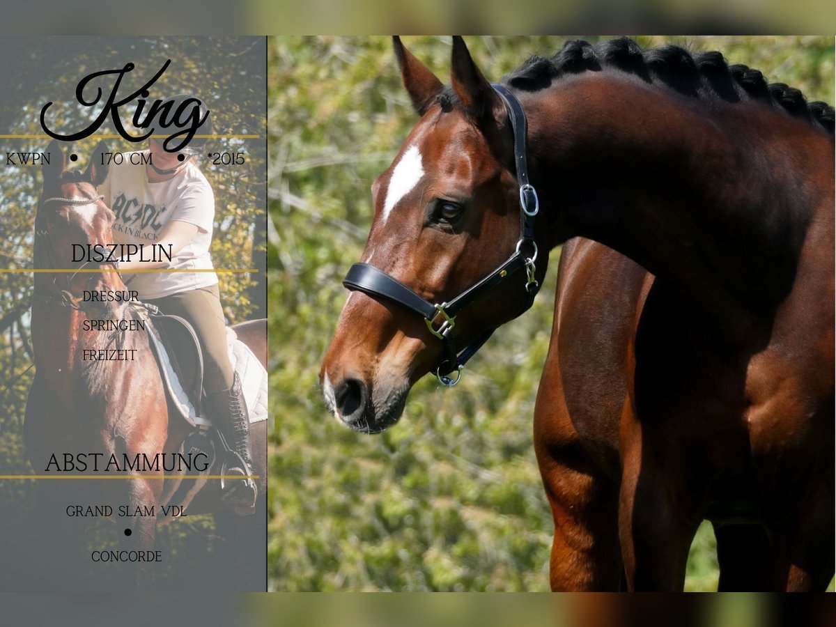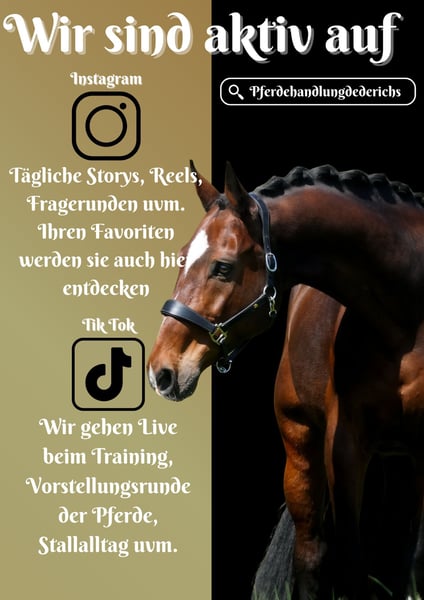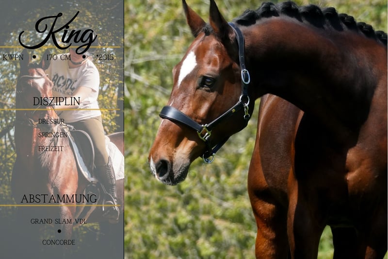 King ist ein 2015 geborener KWPN Wallach ca. 168 cm v. Grand Slm, Cadento, Capitol, Heartbreaker x Concorde, Purioso *King* Wunderschöner Allrounder mit guter Ausbildung. Einfach zu reiten, sehr Lektionssicher, kann dazu noch spanischen Schritt und macht bei einfach allem Freude. Er bringt 3 schöne GGA mit. In der Vergangenheit in Holland bis M1 platziert. Im Gelände geht er brav und auch durchs Wasser reiten, über Baumstämme Springen machen mit ihm Freude. Fahrzeuge sind auch kein Problem. Er ist ein ruhiger Typ. Man fühlt sich auf ihm einfach pudelwohl. Ein ganz toller Allrounder !!! SCHAUEN SIE SICH UNBEDINGT SEIN VIDEO AN !!! Im Umgang super erzogen und Menschenbezogen, mag es betüddelt zu werden. Charakter, Optik und seine Ausbildung, lassen ihn zum absoluten Traumpferd werden. Ein aktuelles Video finden Sie hier in der Anzeige oder unter folgendem Link: https://www.youtube.com/watch?v=5gITXhuaXSY Pferdehandlung Dederichs – Ihr Partner für den Pferdekauf Kontakt & Erreichbarkeit: Anfragen bitte ausschließlich telefonisch unter 0173/9792139 Montag – Freitag: 09:00 – 18:00 Uhr Samstag: 09:00 – 15:00 Uhr Sonntag: Ruhetag Folgen Sie uns auf Social Media! Erleben Sie unseren Alltag mit den Verkaufspferden auf Instagram, TikTok & Facebook unter Pferdehandlung Dederichs Rabatt: Bei sofortiger Mitnahme Ihres neuen Traumpferdes erhalten Sie zwischen 5 %– 10 % Rabatt Probereiten & Vorführen: • Probereiten: 40 € pro Pferd (max. 2 Reiter), Betrag wird beim Kauf angerechnet • Feiertage: Proberitt 50 € • Vorführung durch unsere Bereiter: 30 € pro Pferd (Vorreiten, Bodenarbeit etc.) Ankaufsuntersuchung & Transport: • Viele unserer Pferde besitzen bereits eine AKU • Sie können selbstverständlich Ihren eigenen Tierarzt mitbringen • Gerne organisieren wir eine Untersuchung • Wir unterstützen Sie auch gerne beim Transport ins neue Zuhause Weitere Verkaufspferde: In unserem Stall stehen weitere Verkaufspferde, die noch nicht online sind. Falls Ihr Traumpferd noch nicht dabei ist, zögern Sie nicht, uns zu kontaktieren. Wichtige Hinweise: • Stockmaß-Angaben sind geschätzt und nicht exakt nachgemessen • Alle Beschreibungen sind subjektive Einschätzungen des Verkäufers und keine zugesicherten Eigenschaften