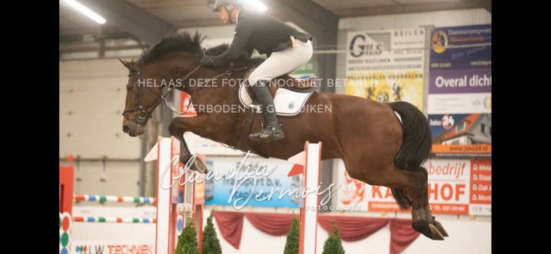 Nice and well-bred strong show jumping horse by Royal Feu x Carthago Mother is Cassandra van Carthago, who has offspring competing at 1.50/1.60 m. Jochie is super well-behaved in handling, loads easily onto the trailer, and has no stable vices or issues. This is a horse with a lot of quality that makes no mistakes in the arena. Jochie has competed with multiple riders in 1.20 m and 1.30 m classes, always placing in the ribbons. Current record: 1.30 m with 7 wins. With Jochie, you can also enjoy nice rides alone in the forest. He also gets along well with other horses in the field. Show jumping videos available via WhatsApp upon request.