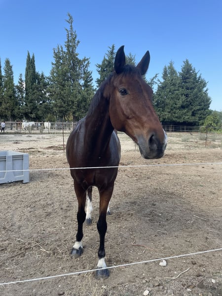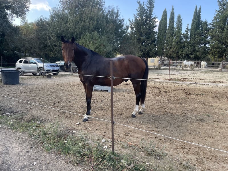 Sehr hübscher Hengst französischer Abstammung, KWPN-Genetik, Jalisco, 12 Jahre alt, 1,70 m groß. Ein Pferd, das seinem Menschen sehr zugetan ist und sich leicht pflegen lässt (Hufschmied, Trocknen, etc. kein Problem). Regelmäßig beim Tierarzt, Osteopathen, geimpft, entwurmt und vom Hufschmied versorgt. Donar ist ein sehr gut ausgebildeter Dressurpferd (Schulter-in, Biegungen, Übergänge, Tempowechsel…), das im Springen bis 1 m leicht zu reiten ist. Ideal für den Hunter, da er nichts scheut (Spinnweben, Stacheln, Fliegen) und eine sehr gleichmäßige Cadence sowie drei schöne Grundgangarten besitzt. Ein tolles Pferd für den Einsatz im Gelände, das vor nichts Angst hat. Donar bleibt ein sehr sensibles und feines Pferd, das einen Galopp 7 benötigt. Er braucht regelmäßiges, abwechslungsreiches Training, um sein volles Potenzial zu entfalten. Auf den ersten Blick wirkt er kühl, doch er wird seine Energie durch den Aufbau einer vertrauensvollen Partnerschaft mit seinem Reiter zeigen. Derzeit lebt er boxiert auf Stroh mit täglichem Auslauf, kann aber auch in einem Paddock mit Unterstand gehalten werden.