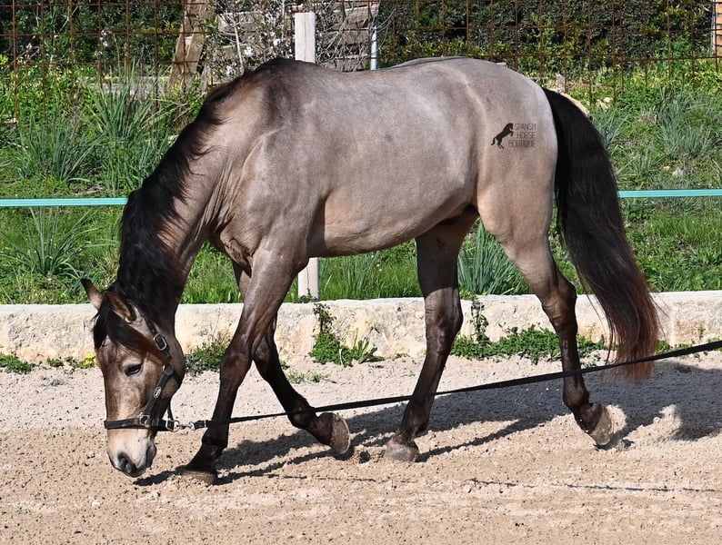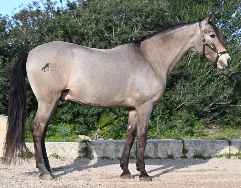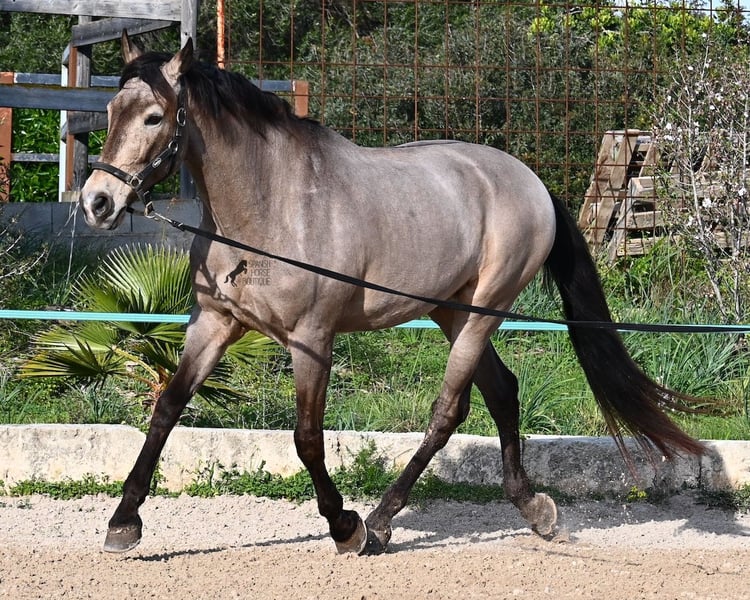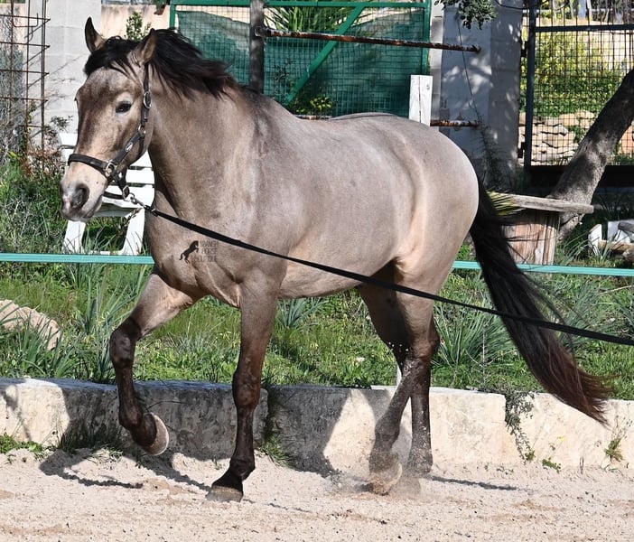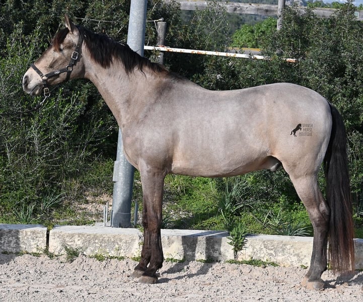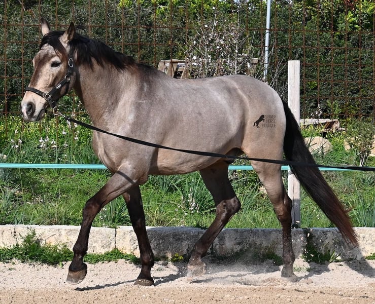 This 2010 born dun (currently in winter shearing, hence the gray color), is a mix of Lusitano and KWPN. He and his owner have been very successful in the dressage arena and have placed several times! Lateral movements, flying changes, canter pirouettes - all a piece of cake for this gelding. He also enjoys going into the field and even parades, such as the traditional animal consecration, with loud music and crowds of people, don't bother him! He is a real treasure to handle, a real protector and gentleman who never takes a wrong step or makes a wrong move. On the lunge he runs like clockwork, responds really well to voice commands and is also clever, because it was very windy at the photo shoot and he had his ears set to aerodynamics ;) Under saddle he WANTS to work and really blossoms. So he is a horse for someone who encourages him and works him 5 times a week, because the two performance breeds in his blood want to be kept busy. It is better to work him 7 times a week than only twice, which is why he is not really suitable for casual leisure riding. As a show professional, he is also easy to load, knows how to be in new places and in his summer dress he is also a real treasure on the outside (photos available). He has also been shown at shows by teenagers with riding experience and behaved well - but they were also kids who can really control his gas ;) He has been a gelding for a long time, so he could easily be integrated into a mixed herd. A fun horse for ambitious riders in his prime! He is currently on Mallorca! Videos and pedigree available on request. I would be happy to organize an AKU, riding, transport or even your trip if you come to see him in person. Details can be found on my website or in conversation. Saludos from Spain