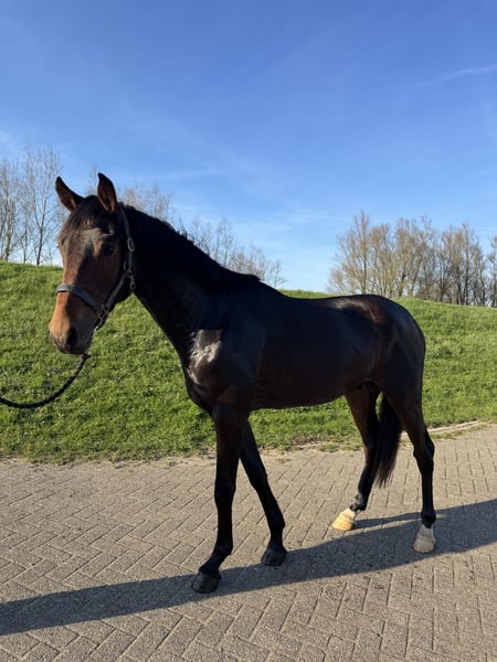 Te koop, onze knappe en talentvolle 3 jarige ruin Thunder D, roepnaam Donder. Een jong paard met een fijne instelling, kwaliteit en een mooie toekomst in het verschiet. Donder is 1.60m maar zal nog wat gaan groeien. Hij is KWPN gefokt, Lantanas x Diego. Donder is recent zadelmak en pakt het werk zeer goed op. Hij laat zich al netjes rijden en heeft inmiddels zijn eerste sprongetje onder het zadel gemaakt, zeer geschikt als allrounder! Ook is hij al een aantal keer mee geweest naar ander terrein, wat hij braaf en rustig oppakt. Ondanks zijn jonge leeftijd laat Donder zich al zeer braaf rijden en zou hij geschikt kunnen zijn voor een jongere of minder ervaren ruiter. Uiteraard is hij nog in opleiding en moet hij verder bevestigd worden, waardoor begeleiding gewenst is. Donder is mensgericht, sociaal met andere paarden, braaf bij de hoefsmid en heeft geen stal gebreken. Hij is klinisch en röntgenologisch goedgekeurd, over keuren mag k.k. Voor meer informatie, foto’s of video’s kunt u een whatsapp sturen naar: 0643797684