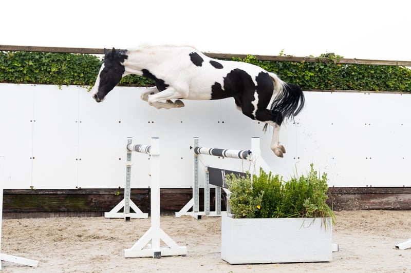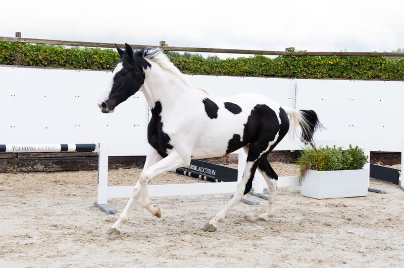 The three-year-old Siebke v.d. Donk R is a beautifully marked pinto with a light-footed way of moving and jumping. In our opinion, she is suitable for multiple disciplines. Her sire is the 8-year-old AES stallion His Pleasure Duborget, half-brother to three 1.50m show jumpers and five 1.40-1.45m jumpers. He is bred from the half-sister of the 1.60m Grand Prix stallions Rahotep de Toscane and Jadis de Toscane. Her dam, Mosegaard’s Franciska, is a pinto mare descending from Favorit ASK (1.45m jumping). She inherited her coloring from her mother, Mosegaard’s Rigolettels (Libero H x Samber).