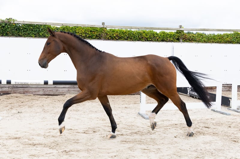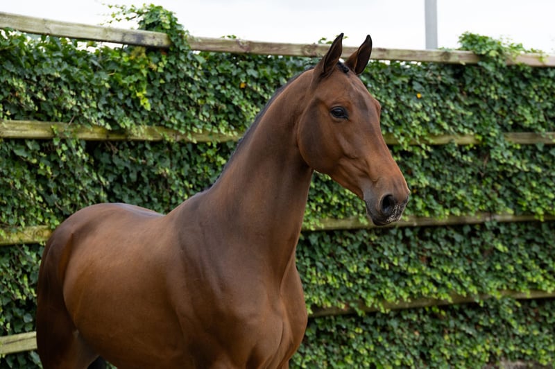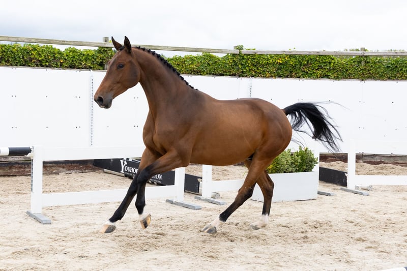 What a fantastic conformation this four-year-old Ruby BH has. He jumps well off the ground and demonstrates good hindquarter technique. Given his build, he should be comfortable to ride later on. His sire, L’Extreme BH (1.35m show jumping), is a son of the 1.50m show jumping mare Shou d’Ouilly and grandson of the 1.55m Grand Prix mare Osiris d’Ouilly. His dam, Klasissa BH (Baloubet du Rouet), is bred from the full sister of the 1.70m Grand Prix stallion Verdi TN, with whom Maikel van der Vleuten competed at the top international level for many years. This mare, Orissa M, produced the CCI4* eventing horse Denver as well as a 1.30m and 1.45m show jumping horse.