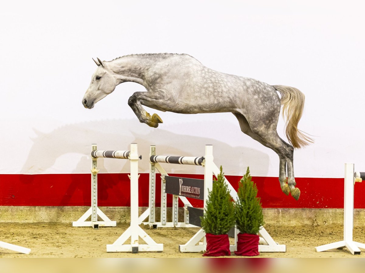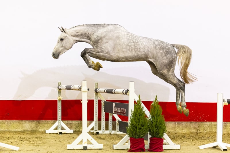 Spike PH is an impressive grey gelding with size. He makes a scopy overall impression and looks very complete in everything he shows. He is quick off the ground, careful and jumps with a good and confident style. He appears to have unlimited scope, combined with light-footedness and a big, balanced canter. Despite his big canter, he is able to jump back easily from the fence, which gives a lot of confidence for future sport. In movement he is exceptionally loose through his body and shows outstanding balance and suppleness. At the auction day, he had only been lightly lunged and was not yet saddle broken. The seller plans to start backing him this or next week and has full confidence in this process due to his cooperative and willing character. There may be an additional video available soon. The breeder deliberately chose a calm and patient upbringing, allowing him to develop physically without pressure. Now that he is approaching his fourth year, it is the right moment to introduce him further to the work. Everything he shows so far confirms that this is a horse with very high sporting expectations. Sire Colestus competed himself at 1.60 m Grand Prix level, achieving podium finishes in CSI5* Grand Prix events in Paris, Shanghai and Dortmund. As a sire, he produced several international performers such as Colestina H (1.60 m), Colmar (1.60 m) and Colettus Cambridge (1.65 m), and is known for passing on scope, reflexes and a modern jumping style. The damline is deep and widely proven in both showjumping and dressage. Dam Infinity is by Elvis Ter Putte, himself successful at 1.60 m level and a highly respected sire. This damline produced multiple sport horses competing at 1.40 m and higher, including Goldika (1.50 m), Elrino (1.45 m), Kontiki (1.40 m), Kensington (1.40 m) and No Mercy PH (1.40 m). Further down the line, the family shows an exceptional number of international results in both jumping and dressage, underlining its durability and quality Spike PH combines size, scope, light-footed movement and a powerful pedigree, making him a very exciting prospect for higher-level sport in the future.
