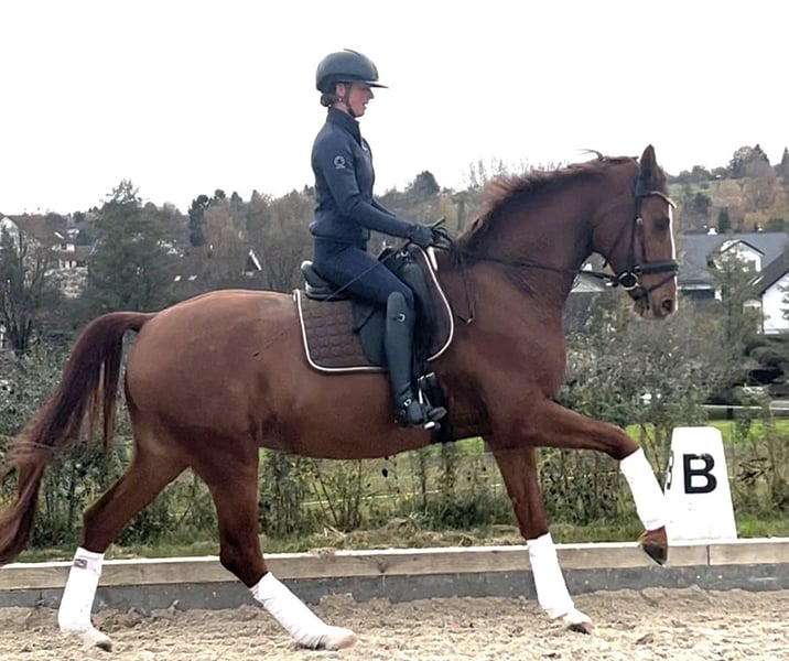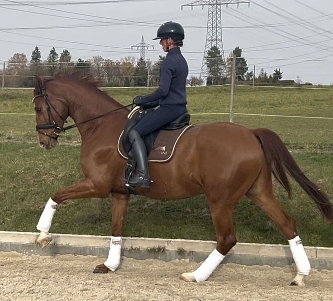 Red Rufus is a tall, well-built gelding that has already achieved wins and high placings in Dressage Horse A. He is on the way to competing at class L and impresses primarily with his completely fearless temperament and exceptional basic gaits. He is not spooky at all during competitions. He enjoys hacking out and is accustomed to daily turnout. X-rays of his back and neck are available and show no findings.