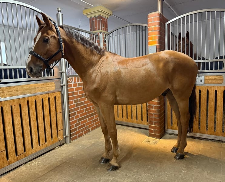 For sale is our handsome seven-year-old gelding Nagano. Nagano is a consistent winner in show jumping competitions and has achieved success up to class M. Currently, he has six wins in young horse jumping classes and M* level competitions, and has also repeatedly performed faultlessly in M**-level events. He impresses on course with his reliability, caution, elasticity, and big heart – a horse that always fights for his rider and acts with composure. Nagano is well-suited for both amateurs and youth riders. In dressage, Nagano is pleasant to ride, always motivated and responsive. He brings great joy to every ride. In handling, he is extremely well-behaved, affectionate, and uncomplicated – whether at the blacksmith, in the field, or during loading, Nagano remains calm and demonstrates his wonderful character.