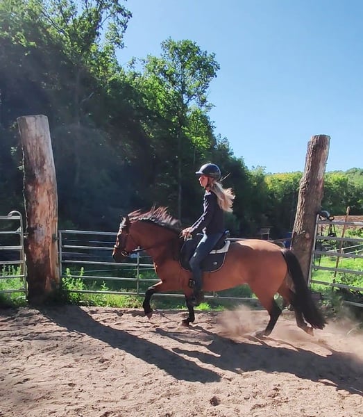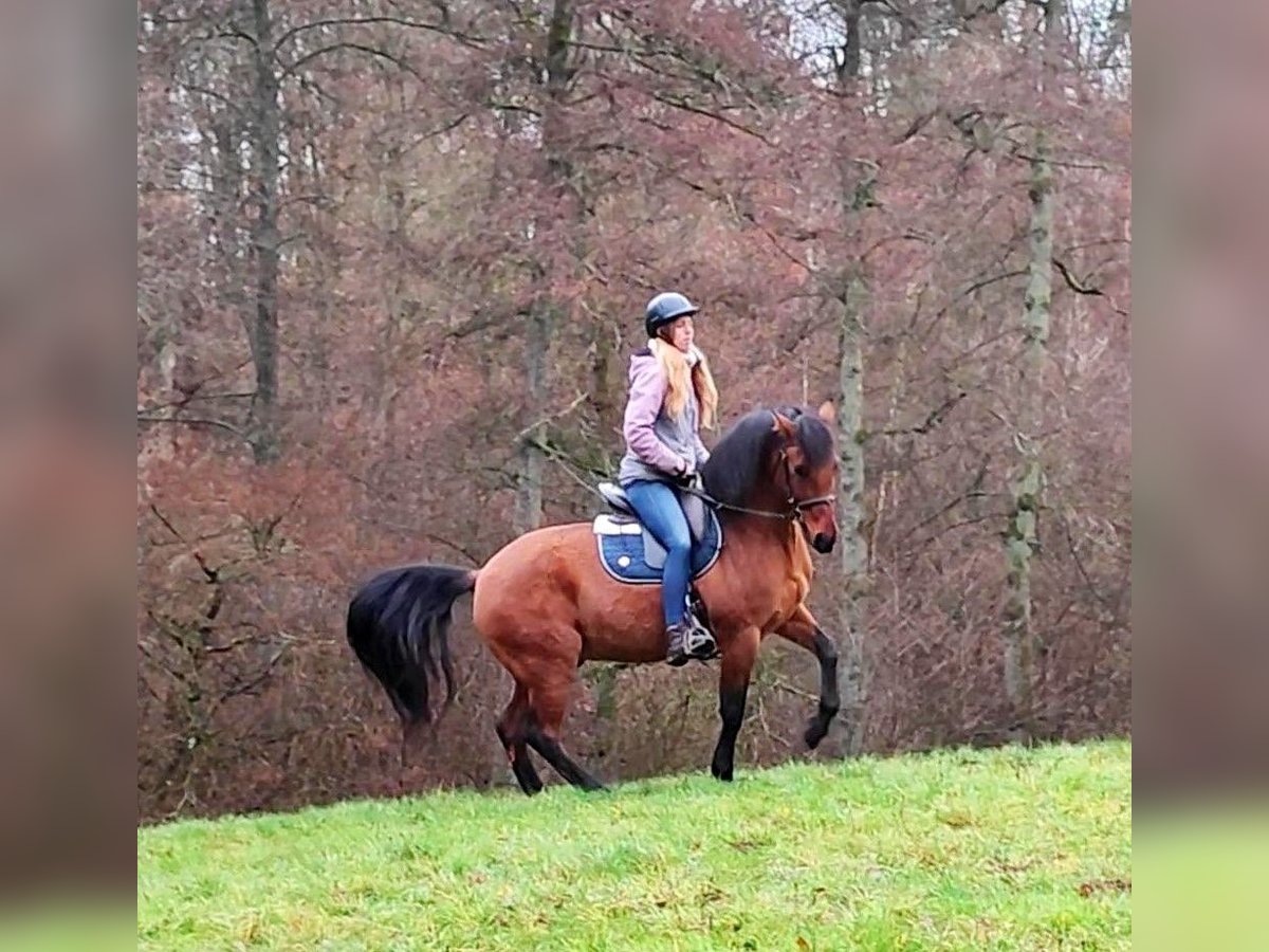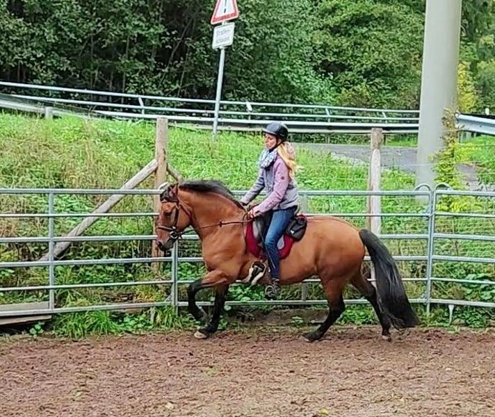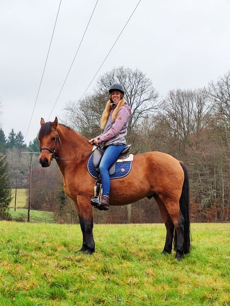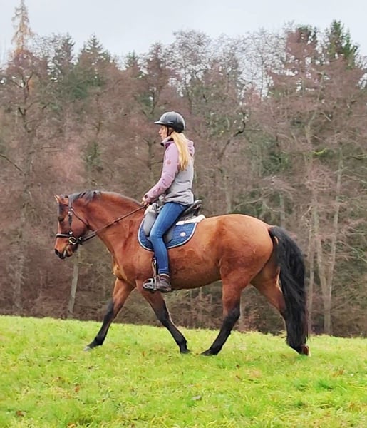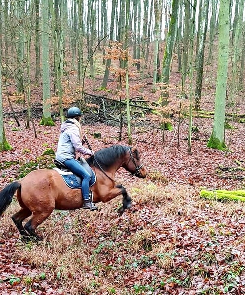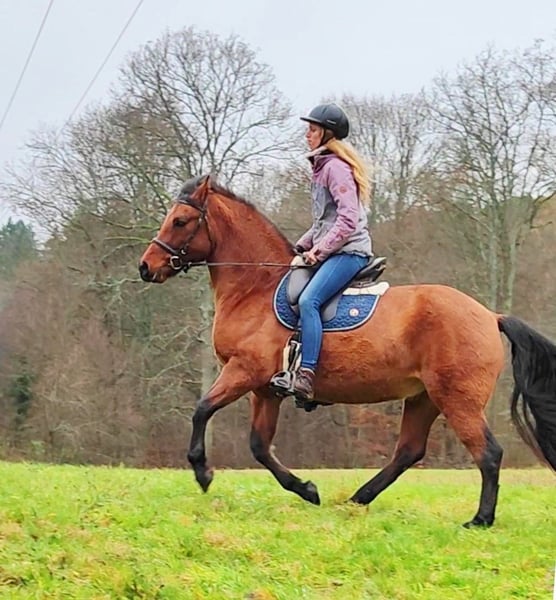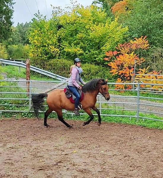 **FOR SALE ON BEHALF OF OWNER** Leonhard's Nike – Versatile and beautiful riding horse for ambitious riders! A 10-year-old, 15.5 hh gelding (PRE x Welsh-D/Haflinger) with full pedigree: Sire: Naviero (Pura Raza Española), Dam: Vanessa (Welsh D / Haflinger), in the striking rare color of bay falcon with a magnificent tail and mane! He was awarded as a premium foal. NIKE immediately impresses with his strong presence and upright posture. Well-mannered and attentive in handling, he delights under saddle with his natural collection and smooth, expressive movement. He is solidly trained in dressage up to level L and rides confidently in the arena and indoor riding hall. The large dressage arena awaits him, and he also shows great talent and enthusiasm in working equitation. A fantastic horse for fun, training, and progression. To work focused and obediently, NIKE benefits from the presence of other horses. He is also accustomed to riding alone, but tends to become uneasy outside his comfort zone, so he is usually ridden in a group. Currently, he is in professional trail riding training and is expanding his skills in this area. NIKE has also been introduced to jumping and demonstrates courage and ambition. He has proven to be a well-behaved school horse and enjoys being ridden in the arena. He has experience in show jumping competitions and in lead-rein classes. He can also perform some circus tricks, such as the Spanish salute. This is an exceptionally versatile and stunning horse for sale! Perfect for re-entrants, ambitious dressage and show jumping riders, or experienced leisure riders. *** VIDEOS and additional pictures/info available via WhatsApp at 0177 8787640 *** NIKE’s three excellent basic gaits are very comfortable to sit, and he can canter very slowly and smoothly. His connection to the bit is fine, making riding and executing learned movements enjoyable. Due to his Spanish temperament, a confident rider who is secure in the saddle and not afraid is recommended. **www.handmade-horses.de** - Trained up to level L (Dressage) - Safe in group trail riding - Suitable for re-entrants / advanced riders - Weight carrier - Healthy - Vaccinated (Tetanus & Influenza) and dewormed - Full papers and equine passport - Farrier- and loading-trustworthy - Includes complete equipment (jump saddle, bridle, blankets, etc.) A pre-purchase examination can be arranged upon request. Getting to know each other & trial riding (50 euros per session), transport to the new home, etc., can be organized after prior arrangement and at the buyer’s expense! NIKE is well-socialized (dominant in the herd), farrier- and loading-trustworthy, currently barefoot, vaccinated against tetanus and influenza, familiar with box stalls, open stalls, and pasture turnout. Excellent health, no illnesses or injuries. The owner is selling this wonderful horse for private reasons and is seeking a caring, supportive home. Please contact me via WhatsApp at 0177 8787640 if genuinely interested.