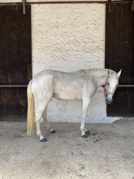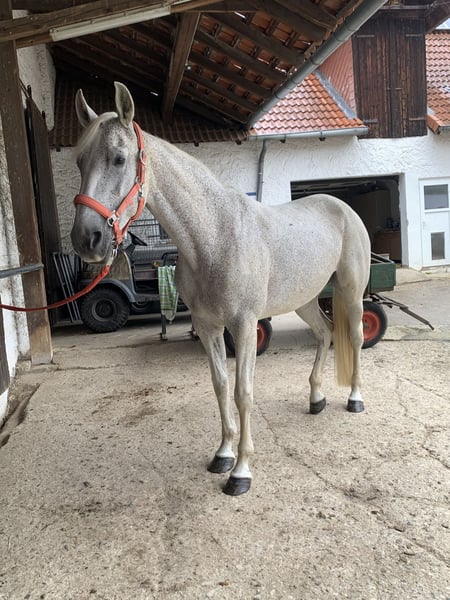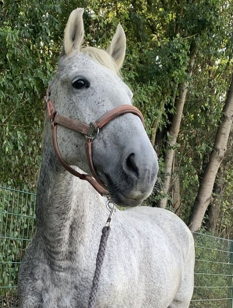 Großrahmige Lusitano Stute, Fliegenschimmel, Stockmaß ca. 160 cm geb. 04.2010, portugiesische Papiere Nach ca. 4 Jahren Pause wieder antrainiert Ich habe sie dieses Jahr für mich als Freizeitpferd gekauft, bin ihr aber als Wiedereinsteiger reiterlich nicht gewachsen. Sie ist kräftig und sie steigt unterm Sattel. Daher ist ein Vorreiten/Probereiten NICHT möglich. Zur Zeit wird sie von mir nur longiert oder spazieren geführt. Sie ist grundsätzlich sehr lauffreudig. Ausdrücklich kein Anfängerpferd! Freundlich zu Mensch und Tier. Steht in kleiner gemischten Gruppe. Zur Zeit 24/7 draußen, kennt aber auch die Box. Sicher im Straßenverkehr, bei Bussen, Regionalbahn, freilaufenden Hunden und Schafen. (Als Lebewesen hat sie natürlich trotzdem das Recht, sich mal zu erschrecken) Klinische AKU (ohne Röntgen) aus 07.25 liegt vor (ohne gravierende Befunde, Zähne Ende 08.25 gemacht, 3 bis zu kirschkerngroße Melanome an der Schweifrübe) Sie geht barhuf, ist schmiedefromm und umgänglich beim Tierarzt Leider nur mit Sedierung zu verladen. ***Bitte den Standort/PLZ beachten. Ich kann das Pferd mangels Anhänger und passendem Zugfahrzeug nicht transportieren*** Privatverkauf: Ich bin kein Händler und suche auf diesem Weg ein geeignetes Zuhause für die Stute. Die Beschreibung beruht auf subjektiven Eindrücken und stellt keine Beschaffenheitvereinbarung dar. Preis verhandelbar