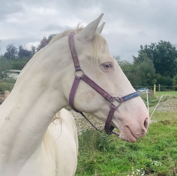 Ausdrucksstarke gekörte PSL (Lusitano) Zuchtstute. In Perlino farbener Jacke und mit 1,63 m ist sie sehr ausdrucksstark und wirkt wie ein Fabelwesen/Einhorn. 🦄 Ein Garant für Sonderfarbene aufgehellte Fohlen, (Palomino, Falbe, usw…) 2011 in Portugal geboren, seit 2016 hier in Deutschland, sehr robust und ohne Ekzem. Ausbildungszustand roh, bisher nur Zuchtstute. Hat 3 von 4 Fohlen hier in Deutschland in der Herde geboren, und wurde im Natursprung gedeckt. Absolut herdenverträglich und sehr sozial. Sie ist eine liebevolle Mutterstute und hat bisher immer allein und komplikationslos abgefohlt. Im Umgang mit dem Menschen ist sie anfangs skeptisch, aber nie böse. Nachzucht kann vor Ort angeschaut werden. All ihre Fohlen haben eine sehr offene dem Menschen zugewandte Art, neugierig, verspielt und immer aufmerksam. Ihren Körperbau und extrem kräftigen Rücken, gepaart mit toller Bewegung und enormer Hinterhand vererbt sie genau so an ihre Fohlen. Diese sind alle sehr gute Reitpferde, sowohl für den Dressur o. Worker Sport und/oder Freizeitbereich, als auch für die Zucht sehr interessant. Ihre gekörte Falbfarbene Mutter, wie auch ihr Vater der bekannte Falbhengst Check-Mate sind sehr groß und Ausdrucksstark. Linien: Ribeiro Telles, Veiga, Palha, Coimbra, Irmaos, Ortigáo Costa Hengste in der Abstammung: Ohio 73,5P., Dardo 72,5P., Habitual 72P., Dital 70,5P., Zelador 80P., Raio 77P., Damasco 76P., Mexico 74,5P., Habil 73,5P., Zagalo 75P. ect... Aus gesundheitlichen Gründen können wir die Zucht leider nicht fortsetzen und reduzieren unseren Bestand.