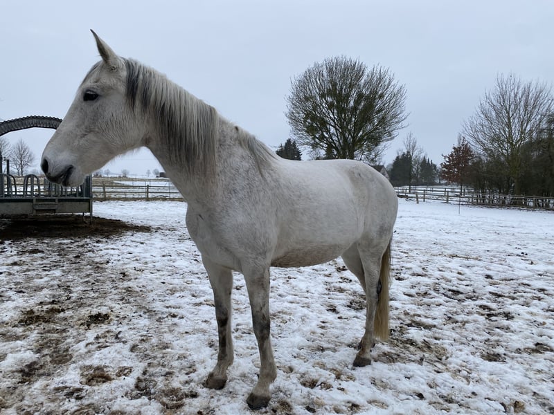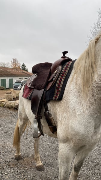 Leisure-ridden Mare from La Perla Stud 15 years old Farrier and loading safe Sensitive and refined to ride Goes alone into the terrain and is traffic-safe. I have covered many kilometers with her, and she has a lovely forward movement. Knows dogs and other animals Very sensitive, Lusitano-like, and more suitable for women Including a custom-made Western saddle and all accessories: knot halter, lead ropes, ground work stick, pads (orthopedic saddle pad), grazing rugs, etc. With a heavy heart, she is looking for her final home because the stable harmony with the two-leggeds simply isn’t working.