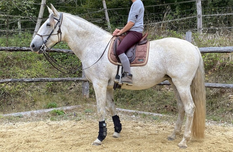 Alizée de La Goudelie is een zachte, goed gebouwde merrie, 1.65m groot, die werkt in de arena en buiten in de lage school (drie gangen, tweesporen oefeningen, boerderij tot boerderij). Opgeleid met een basis in ethologie. Leeft in een kudde met haar zussen en soortgenoten in de wei met schuilstal. Tandarts OK, twee of drie keer per jaar ontwormd. Zijn vader was gekwalificeerd in dressuur op Saint Georges niveau en in springen (zie foto op de harasdelagoudelie.com website). Zijn moeder heeft Veiga-bloed in haar afstamming, wat hem levendigheid geeft met een vrij stabiel karakter. De getoonde prijs is exclusief BTW en in Frankrijk moet een BTW van 10% worden toegevoegd als de verkoop voor fokdoeleinden is, of 20% als de verkoop voor vrijetijdsdoeleinden is.