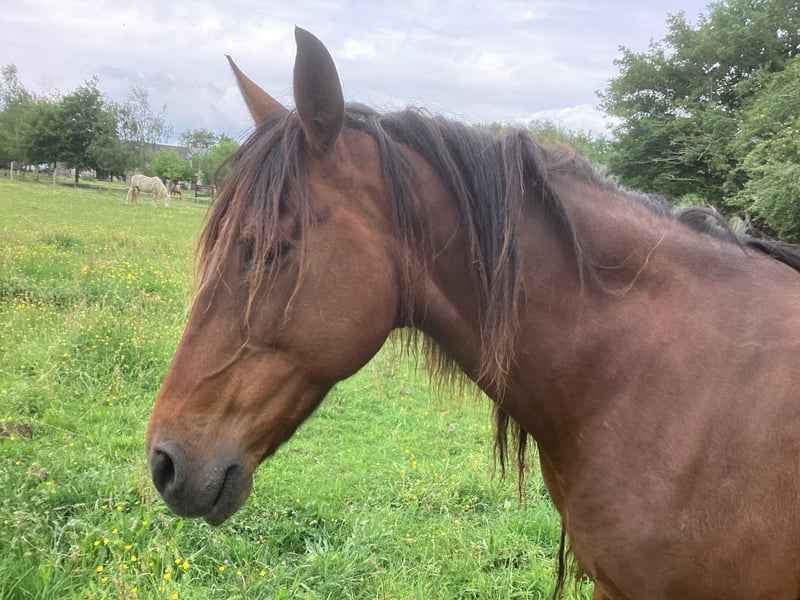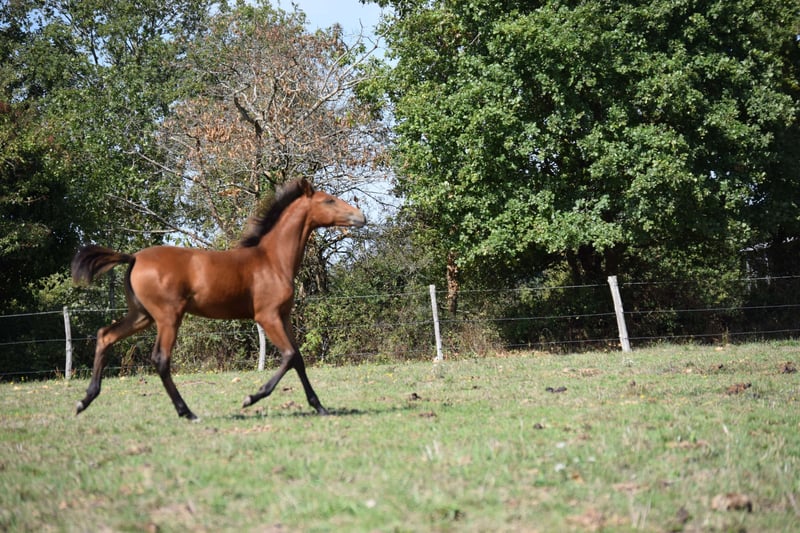 Palma du moulin cassé Par salsa des Noues Et Pablo du chalet Palma du moulin cassé Très gentille pouliche disponible à la réservation pour le sevrage. Palma est née début mai dans notre petit élevage familial. Elle est de robe baie claire très fine et très brillante. Elle est manipulé régulièrement , elle adore les câlins, c’est un véritable pot de colle. Elle vit au pré avec sa mère et d’autres chevaux et poulains. Lors de la vente, elle saura marcher au licol, tenir à l’attache, donner ses pieds et voyager en van. Elle a déjà commencé ce travail. Palma est une pouliche très joueuse et très chic qui recherche l’homme. Elle fera le bonheur d’une personne désireuse de nouer une grande complicité. Elle nous montre de très bonnes aptitudes pour du dressage en liberté. Elle est vraiment très attachante. Possibilité de voir sur place son propre frère de 2 ans, sa mère et son père. Elle mesurera environ 1,58m Les parents ne sont pas approuvés, elle est donc de race Lusitanienne Origine Constatée Possibilité de rester en pension pâture Photos 7,8&9 : le père, Pablo du Chalet Photo 10 & 11: la mère Salsa des Noues Pouliche a voir absolument ! Autres renseignements par téléphone