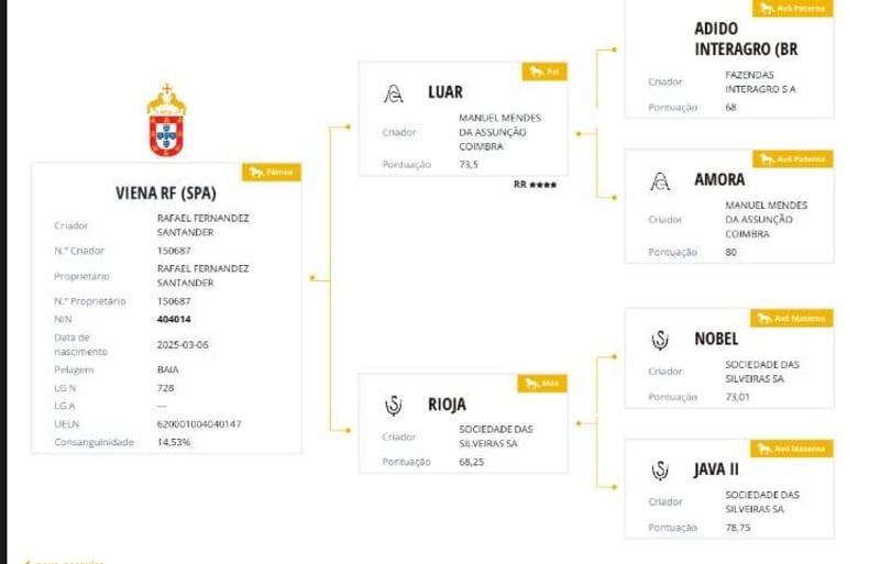 Viena RF es una potra de pura raza lusitana hija del semental LUAR multipremiado campeón de todo en doma vaquera y habiendo competido también en doma clásica con grandes aptitudes. Su madre RIOJA SS es una yegua del hierro de Silveiras de sus mejores líneas de capa albina. En esta potra podemos encontrar un tesoro genético, grandes movimientos y carácter junto con la exclusividad de su capa baya. Ideal para usarla en cualquier disciplina dada su genética y su complexión física para el deporte o para hacer ganadería gracias a su tesoro genético y la exclusividad de su capa. Adjunto fotos y vídeos de sus padres y de ella.