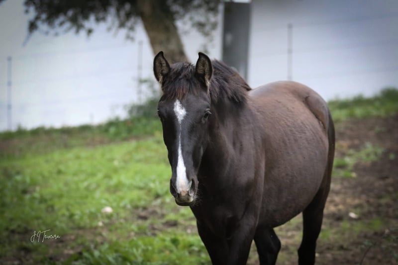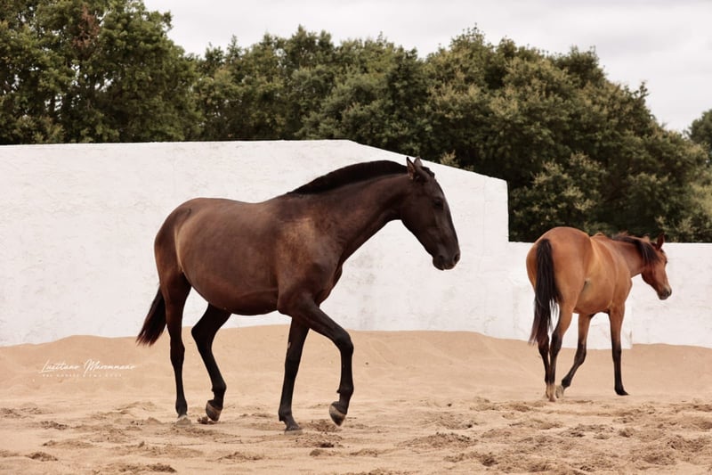 Charmante jeune jument avec beaucoup de potentiel - Race : Lusitanien - Sexe : jument - Année de naissance : 2023 - Robe : noire - Hauteur au garrot : 160 cm, taille finale estimée Nous proposons à la vente une jument lusitanienne exceptionnelle qui a vu le jour en 2023. Cette jeune dame ne séduit pas seulement par son apparence élégante de cheval noir avec le gène Cream, mais aussi par son potentiel impressionnant. Son ascendance, qui amène avec elle le célèbre grand-père ESCORIAL, est un autre point qui attire l'attention. TINTOREIRA se montre désireuse d'apprendre et talentueuse, ce qui fait d'elle une candidate prometteuse pour son futur propriétaire. Plus tard, elle sera polyvalente et TINTOREIRA est également très intéressante pour l'élevage. Actuellement, la jeune jument grandit dans un élevage adapté à son espèce, où elle peut grandir en toute tranquillité et où elle est nourrie avec les meilleurs aliments. Bien entendu, elle est très compatible avec les juments plus âgées et plus jeunes du troupeau. Si vous êtes intéressés, je peux vous envoyer d'autres photos et vidéos.