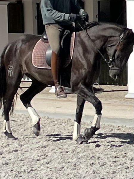 Sinfonia is a beautiful black mare who enjoyed her youth in a herd in freedom at our stud (www.coudelaria-linda-oliveira.com). Now, at three and a half years old, she is stabled and has been gently started under saddle. In summer, her coat shines chocolate brown, and in winter she is a black. She shows exemplary rideability and willingness to cooperate in her first steps under saddle. She possesses three good basic gaits, a harmonious conformation, and the proverbial "clear mind" of a Lusitano. She will bring much joy to her future owner and be a great partner. This is an opportunity to find and secure your dream horse at this early stage. She can stay with us for further training, and we also offer the rider the option to stay in our comfortable guesthouse and grow together with their horse through excellent lessons. She could also be of interest for breeding, as she has very good bloodlines from the Ortigao Costa breeding in her pedigree and can pass on the rare black color in Lusitanos. For more details and information, feel free to contact us via WhatsApp at +49 17644482124.