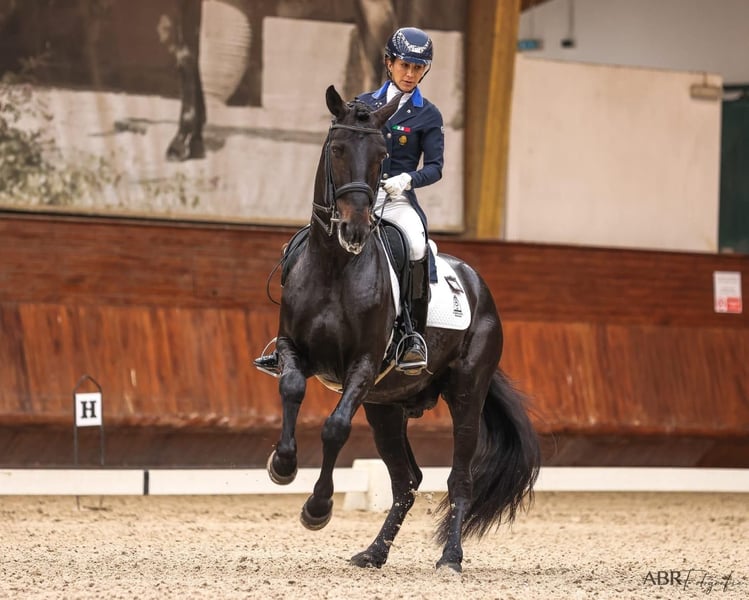 black GP schoolmaster Lusitano This is a spectacular 9-year-old Lusitano stallion standing at 162cm, who competed in 2024 in the small tour and won the silver medal at the Portuguese championships. This year, he has already competed in some Inter A. A horse ready to go directly into high-level competitions, perfect for an ambitious amateur or professional rider. Amazing mindset, top character, expressive movements, and performing an incredible piaffe/passage. Fantastic opportunity for a top competition Lusitano! Do you want to know more about this black beauty? Send me a PM or WhatsApp at 00491786997334. Jasmin from Top-Lusitanos